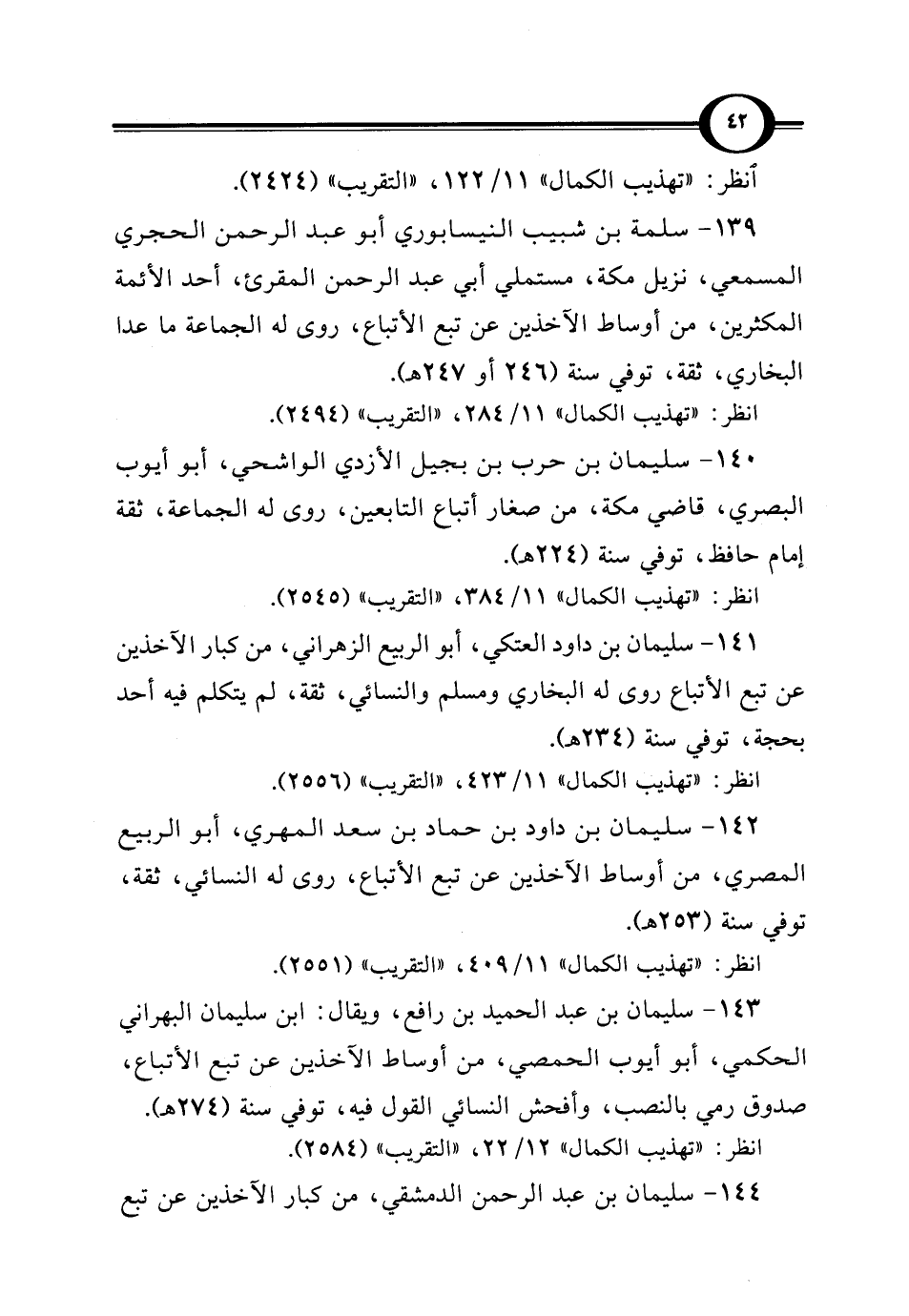 142 - سليمان بن داود بن حماد بن سعد المهري، أبو الربيع المصري، من أوساط الآخذين عن تبع الأتباع، روى له النسائي، ثقة، توفي سنة (253 هـ).