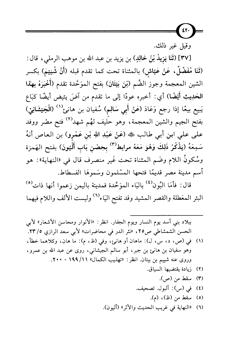 [37] (ثَنَا يَزِيدُ بْنُ خَالِدٍ) بن يزيد بن عبد الله بن موهب الرملي، قال: (ثَنَا مُفَضَّل، عَنْ عَيَّاشٍ) بالمثناة تحت كما تقدم قبله (أَنَّ شُيَيْمَ) بكسر الشين المعجمة وجوز الضَّم (بْنَ بَيْتَانَ) بفتح الموَحَّدة تقدم (أَخْبَرَهُ بهذا الحَدِيثِ أَيْضًا) أي: أخبره عودًا إلى ما تقدم من آضَ يئيض أيضًا كبَاع يَبيع بيعًا إذا رجع وَعَادَ (عَنْ أَبِي سَالِمٍ) سُفيان بن هانئ (¬1) (الْجَيشَانِيِّ) بفتح الجيم والشين المعجمة، وهو حليف لهُم شهد (¬2) فتح مصْر ووفد على علي بن أبي طالب - رضي الله عنه - (عَنْ عَبْدِ اللهِ بْنِ عَمْرٍو) بن العاص أنهُ سَمِعَهُ (يَذْكُرُ ذَلِكَ وَهُوَ مَعَهُ مرابط (¬3) بِحِصْنِ بَابِ أَلْيُونَ) بفتح الهَمزة وسُكونُ اللام وضم المثناة تحت غَير منصرف قال في "النهاية": هو اسم مدينة مصر قديمًا فتحها المسْلمون وسَموهَا الفسطاط.