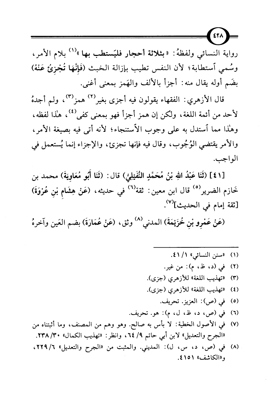 رواية النسائي ولفظهُ: "بثلاثة أحجار فليَستطب بها" (¬1) بلام الأمر، وسُمي استطابة؛ لأن النفس تطيب بإزالة الخبث (فَإِنَّهَا تُجْزِئُ عَنْهُ) بضَم أوله يقال منه: أجزأ بالألف والهَمز بمعنى أغنى.