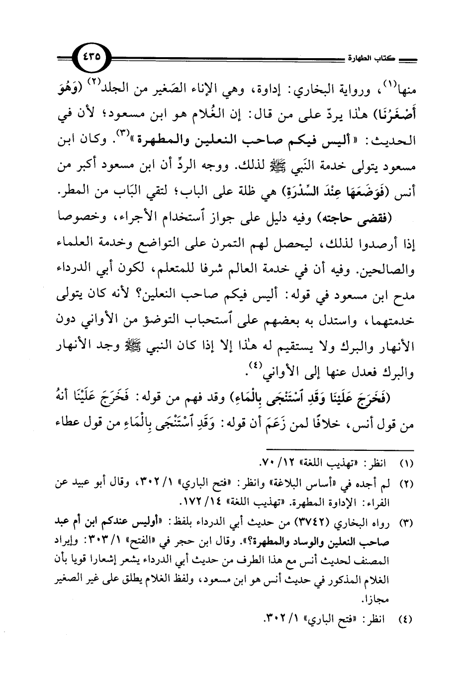 (¬3) رواه البخاري (3742) من حديث أبي الدرداء بلفظ: "أوليس عندكم ابن أم عبد صاحب النعلين والوساد والمطهرة؟ ". وقال ابن حجر في "الفتح" 1/ 303: وإيراد المصنف لحديث أنس مع هذا الطرف من حديث أبي الدرداء يشعر إشعارا قويا بأن الغلام المذكور في حديث أنس هو ابن مسعود، ولفظ الغلام يطلق على غير الصغير مجازا.