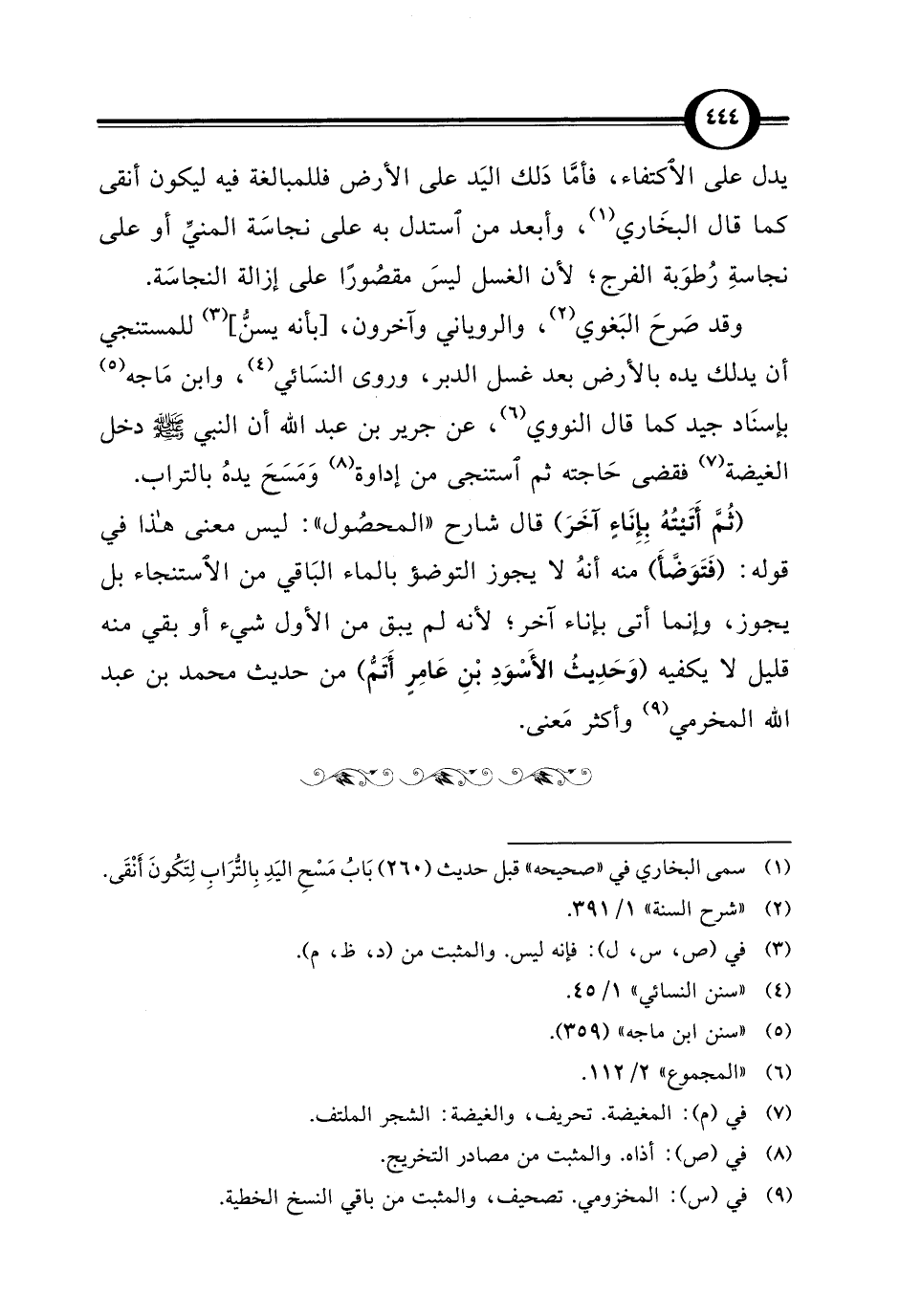 وقد صَرحَ البَغوي (¬2)، والروياني وآخرون، [بأنه يسنُّ] (¬3) للمستنجي أن يدلك يده بالأرض بعد غسل الدبر، وروى النسَائي (¬4)، وابن مَاجه (¬5) بإسنَاد جيد كما قال النووي (¬6)، عن جرير بن عبد الله أن النبي - صلى الله عليه وسلم - دخل الغيضة (¬7) فقضى حَاجته ثم استنجى من إداوة (¬8) وَمَسَحَ يدهُ بالتراب.