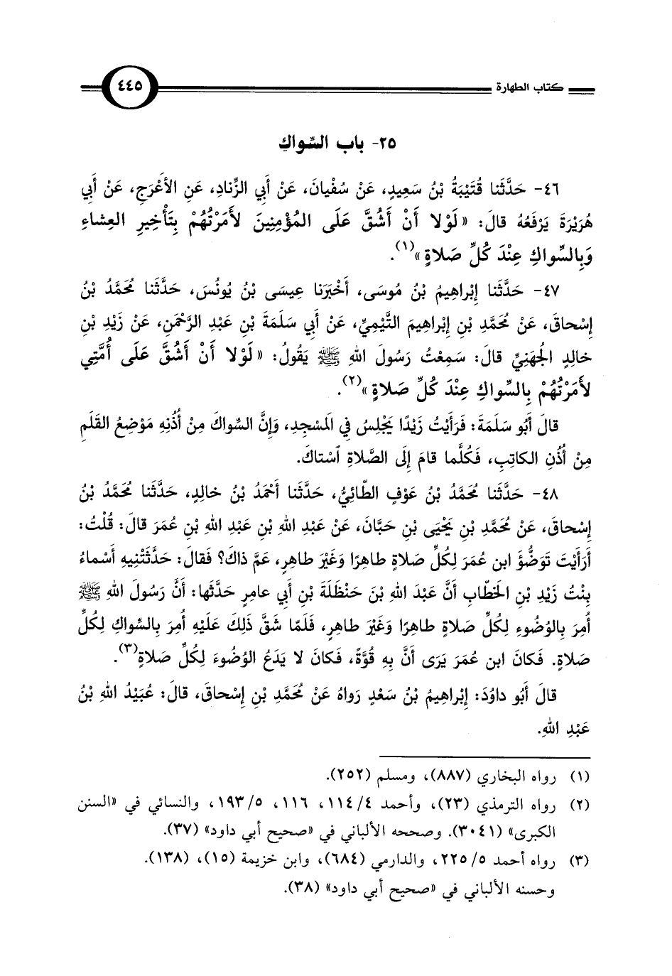 47 - حَدَّثَنا إِبْراهِيمُ بْن مُوسَى، أَخْبَرَنا عِيسَى بْنُ يُونُسَ، حَدَّثَنا مُحَمَّدُ بْن إِسْحاقَ، عَنْ مُحَمَّدِ بْنِ إِبْراهِيمَ التَّيْمِيِّ، عَنْ أَبِي سَلَمَةَ بْنِ عَبْدِ الرَّحْمَنِ، عَنْ زَيْدِ بْنِ خالِدٍ الجُهَنِيِّ قالَ: سَمِعْتُ رَسُولَ اللهِ - صلى الله عليه وسلم - يقُولُ: "لَوْلا أَنْ أَشُقَّ عَلَى أُمَّتِي لأَمَرتُهُمْ بِالسِّواكِ عِنْدَ كُلِّ صَلاةٍ" (¬2).