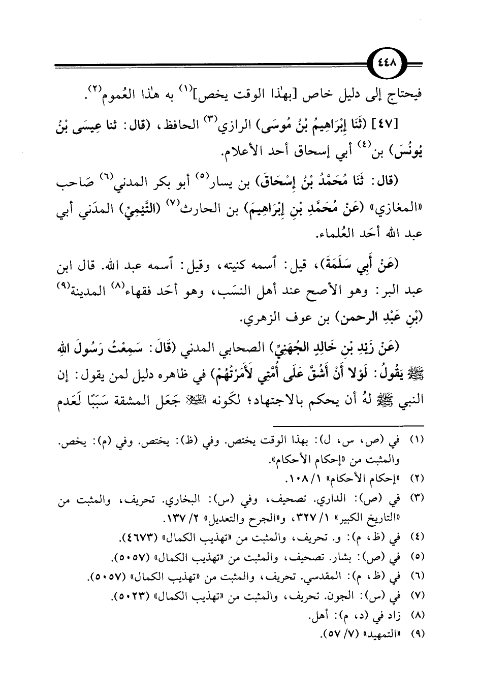 (عَنْ زَيْدِ بْنِ خَالِدٍ الجُهَنِيِّ) الصحابي المدني (قَالَ: سَمِعْتُ رَسُولَ اللهِ - صلى الله عليه وسلم - يَقُولُ: لَوْلا أَنْ أَشُقَّ عَلَى أُمَّتِي لَأَمَرْتُهُمْ) في ظاهره دليل لمن يقول: إن النبي - صلى الله عليه وسلم - لهُ أن يحكم بالاجتهاد؛ لكَونه عليه السلام جَعَل المشقة سَبَبًا لَعَدم
