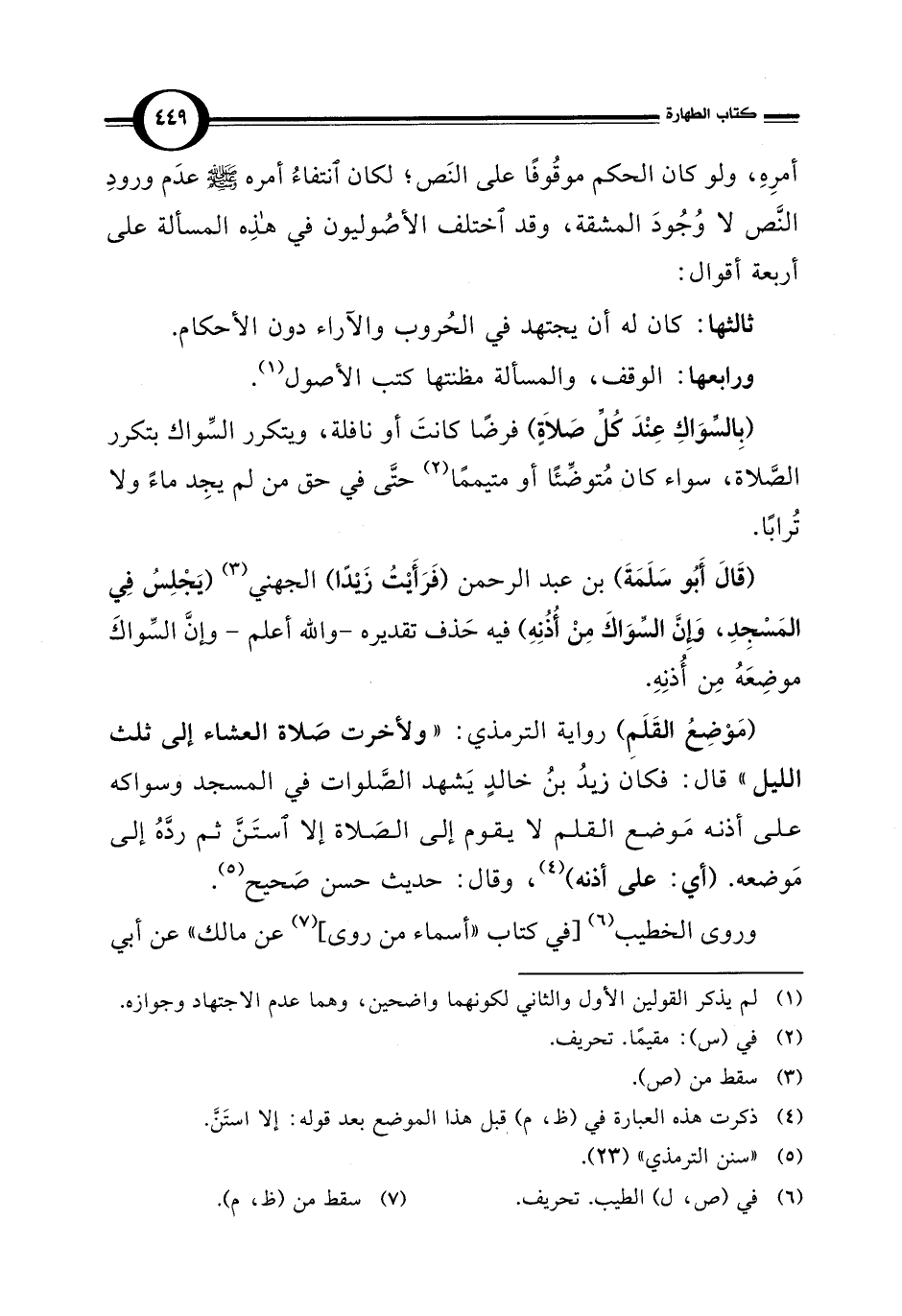 (مَوْضِعُ القَلَمِ) رواية الترمذي: " ولأخرت صَلاة العشاء إلى ثلث الليل" قال: فكان زيدُ بنُ خالدٍ يَشهد الصَّلوات في المسجد وسواكه على أذنه مَوضع القلم لا يقوم إلى الصَّلاة إلا استَنَّ ثم ردَّهُ إلى مَوضعه. (أي: على أذنه) (¬4)، وقال: حديث حسن صَحيح (¬5).