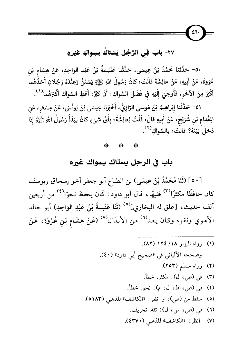 [50] (ثَنَا مُحَمَّدُ بْنُ عِيسَى) بن الطباع أبو جعفر أخو إسحاق ويوسف كان حافظًا مكثرًا (¬3) فقيهًا، قال أبو داود: كَان يحفظ نحوًا (¬4) من أربعين ألف حديث، [علق له البخاري] (¬5) (ثَنَا عَنْبَسَةُ بْنُ عَبْدِ الوَاحِدِ) أبو خالد الأموي وثقوه وكان يعد (¬6) من الأبدَال (¬7) (عَنْ هِشَامِ بْنِ عُرْوَةَ، عَنْ