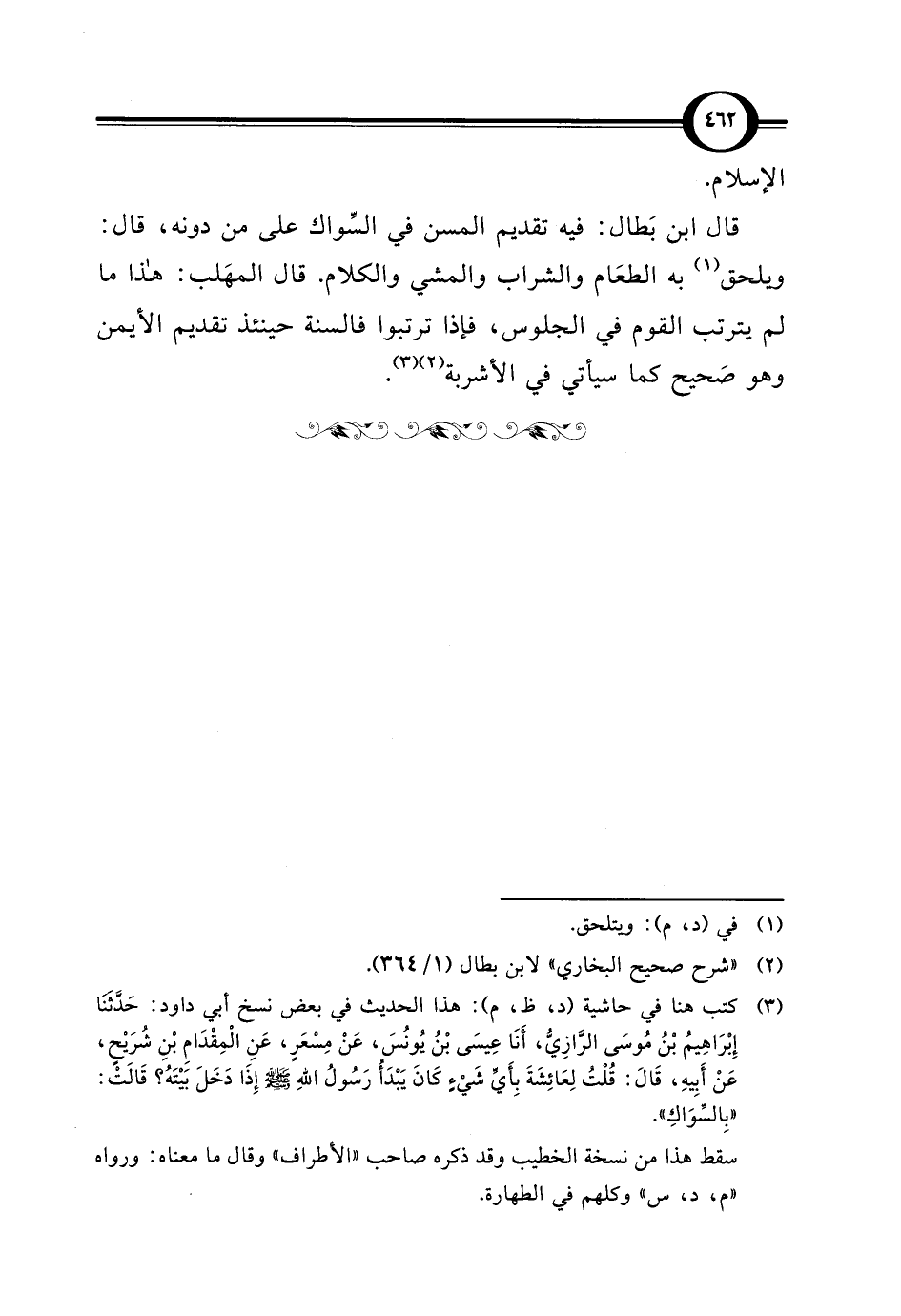 (¬3) كتب هنا في حاشية (د، ظ، م): هذا الحديث في بعض نسخ أبي داود: حَدَّثنَا إِبْرَاهِيمُ بْنُ مُوسَى الرَّازِيُّ، أَنَا عِيسَى بْنُ يُونُسَ، عَنْ مِسْعَرٍ، عَنِ الْمِقْدَامِ بْنِ شُرَيْحٍ، عَنْ أَبِيهِ، قَالَ: قُلْتُ لِعَائِشَةَ بِأَيِّ شَيءٍ كَانَ يَبْدَأُ رَسُولُ اللهِ - صلى الله عليه وسلم - إِذَا دَخَلَ بَيْتَهُ؟ قَالَتْ: "بِالسِّوَاكِ".