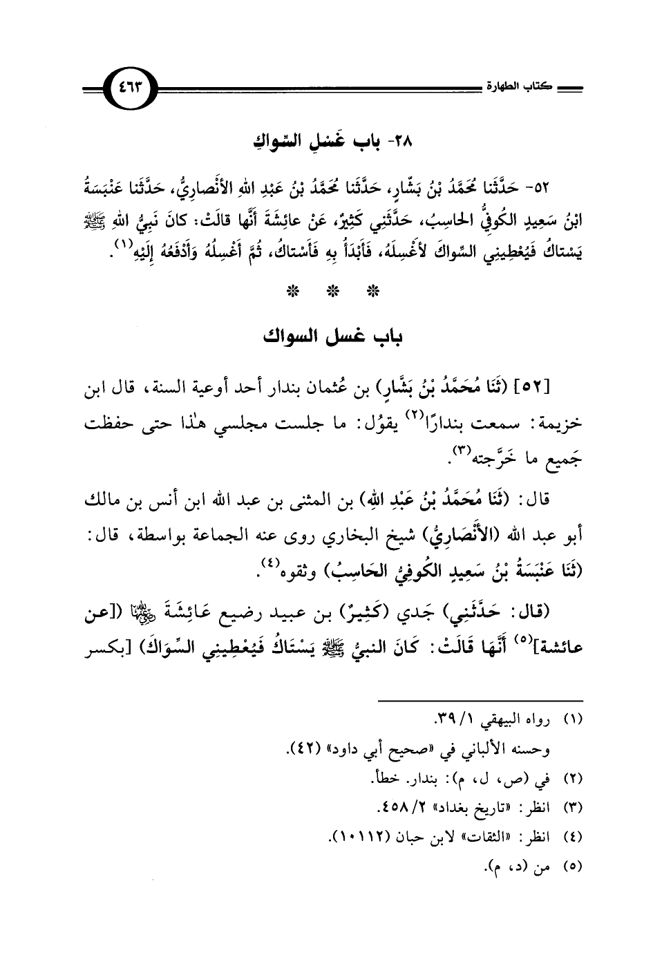 [52] (ثَنَا مُحَمَّدُ بْنُ بَشَّارٍ) بن عُثمان بندار أحد أوعية السنة، قال ابن خزيمة: سمعت بندارًا (¬2) يقوُل: ما جلست مجلسي هذا حتى حفظت جَميع ما خَرَّجته (¬3).