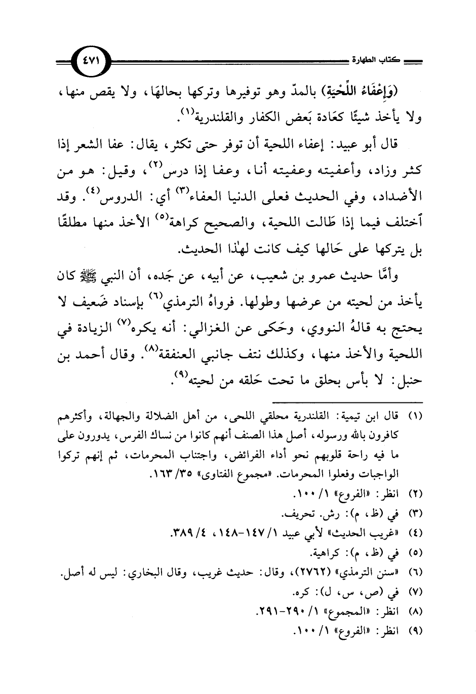 وأمَّا حديث عمرو بن شعيب، عن أبيه، عن جَده، أن النبي - صلى الله عليه وسلم - كان يأخذ من لحيته من عرضها وطولها. فرواهُ الترمذي (¬6) بإسناد ضَعيف لا يحتج به قالهُ النووي، وحَكى عن الغزالي: أنه يكره (¬7) الزيادة في اللحية والأخذ منها، وكذلك نتف جانبي العنفقة (¬8). وقال أحمد بن حنبل: لا بأس بحلق ما تحت حَلقه من لحيته (¬9).
