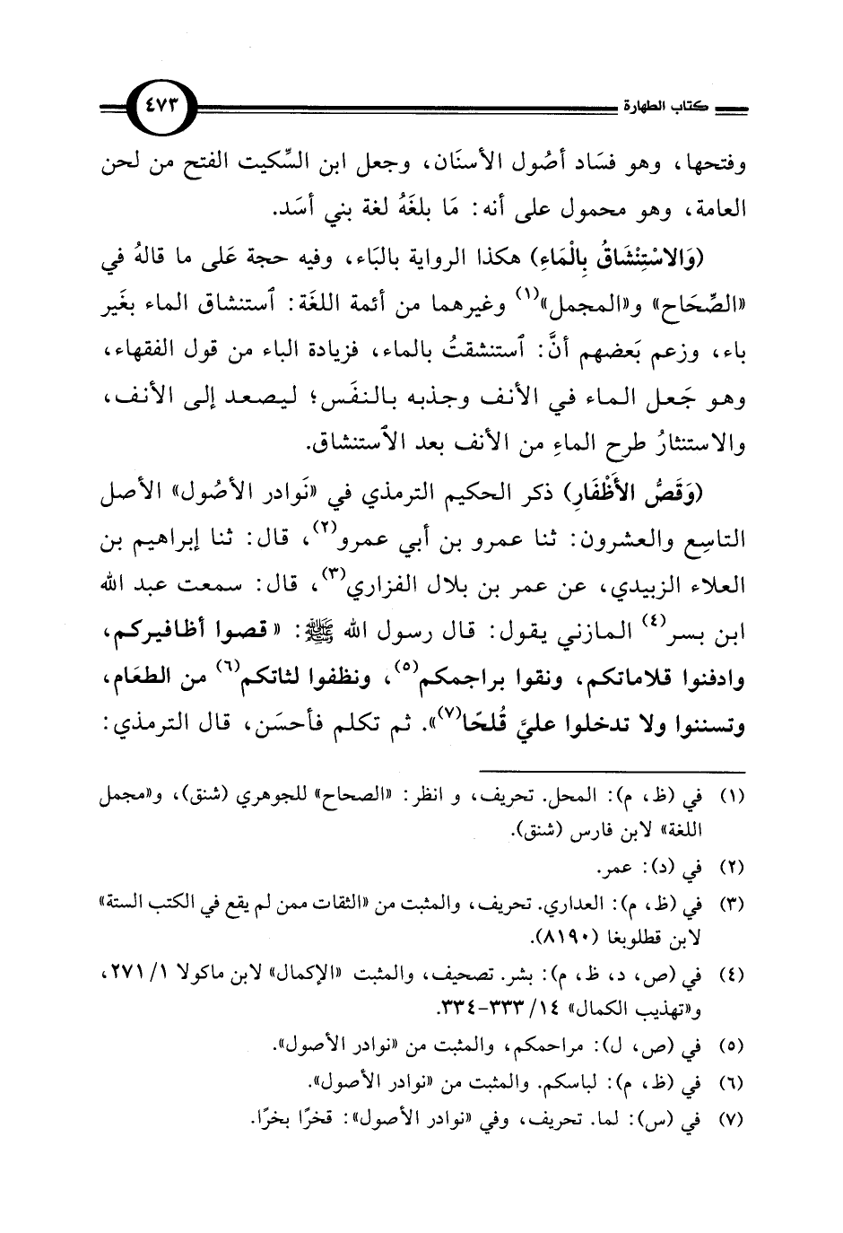 (وَقَصُّ الأَظْفَارِ) ذكر الحكيم الترمذي في "نَوادر الأصُول" الأصل التاسِع والعشرون: ثنا عمرو بن أبي عمرو (¬2)، قال: ثنا إبراهيم بن العلاء الزبيدي، عن عمر بن بلال الفزاري (¬3)، قال: سمعت عبد الله بن بسر (¬4) المازني يقول: قال رسول الله - صلى الله عليه وسلم -: "قصوا أظافيركم، وادفنوا قلاماتكم، ونقوا براجمكم (¬5)، ونظفوا لثاتكم (¬6) من الطعَام، وتسننوا ولا تدخلوا عليَّ قلحًا (¬7) ". ثم تكلم فأحسَن، قال الترمذي: