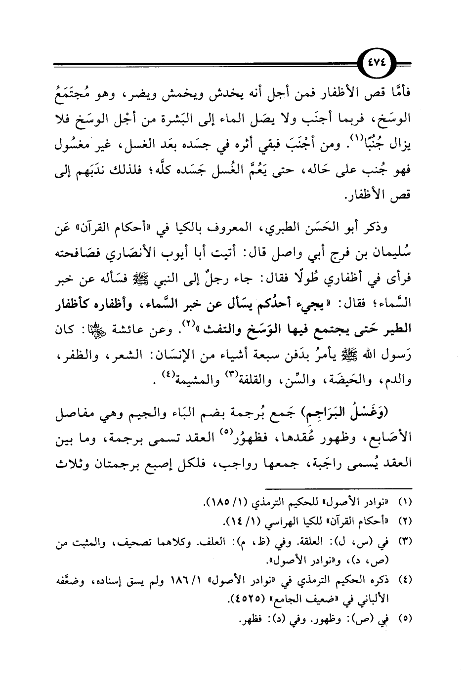 (وَغَسْلُ البَرَاجِمِ) جَمع بُرجمة بضم البَاء والجيم وهي مفاصل الأصَابع، وظهور عُقدها، فظهوُر (¬5) العقد تسمى برجمة، وما بين العقد يُسمى راجَبة، جمعها رواجب، فلكل إصبع برجمتان وثلاث