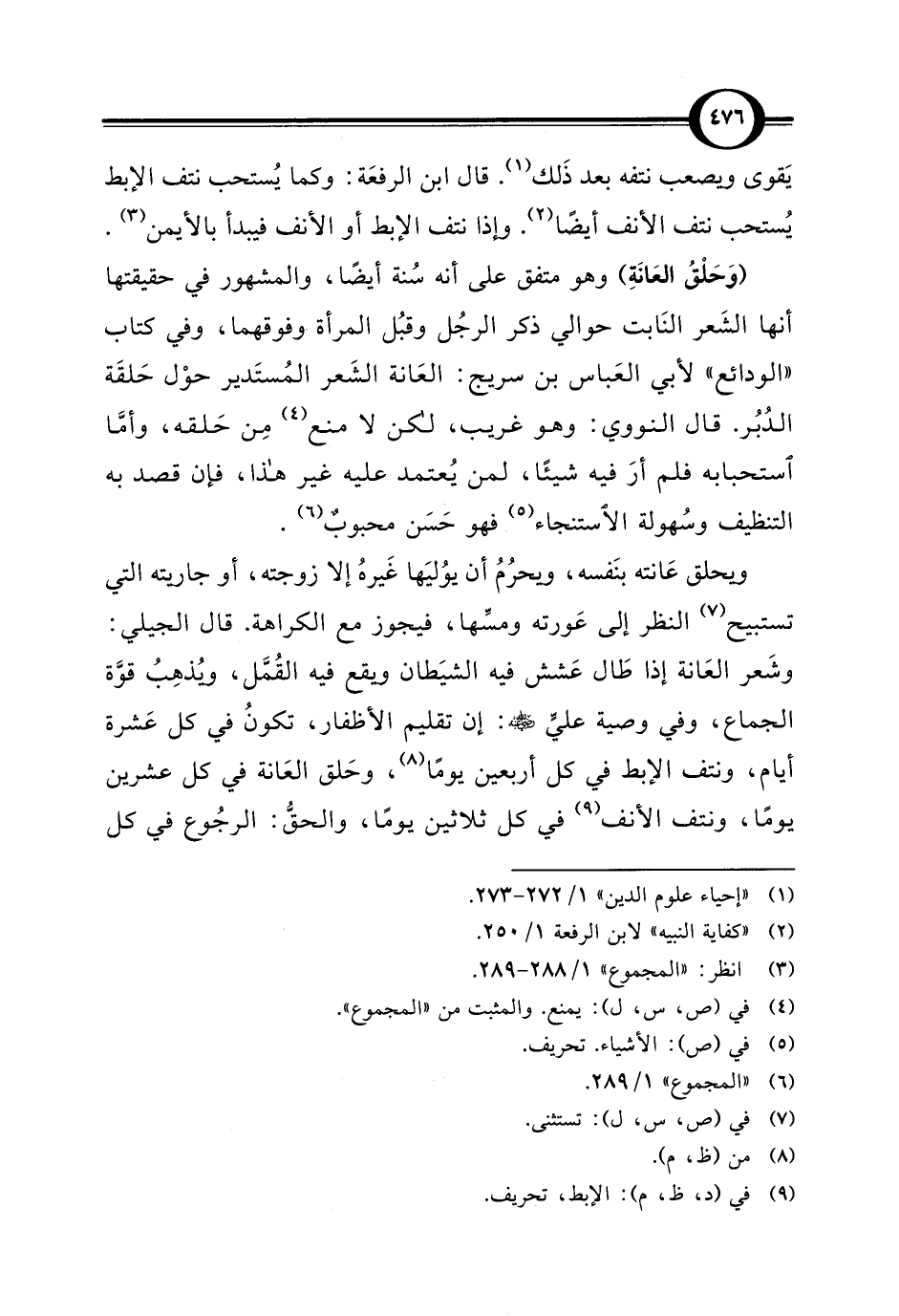 (وَحَلْقُ العَانَةِ) وهو متفق على أنه سُنة أيضًا، والمشهور في حقيقتها أنها الشَعر النَابت حوالي ذكر الرجُل وقبُل المرأة وفوقهما، وفي كتاب "الودائع" لأبي العَباس بن سريج: العَانة الشَعر المُستَدير حوْل حَلقَة الدُبُر. قال النووي: وهو غريب، لمن لا منع (¬4) مِن حَلقه، وأمَّا استحبابه فلم أرَ فيه شيئًا، لمن يُعتمد عليه غير هذا، فإن قصد به التنظيف وسُهولة الاستنجاء (¬5) فهو حَسَن محبوبٌ (¬6).