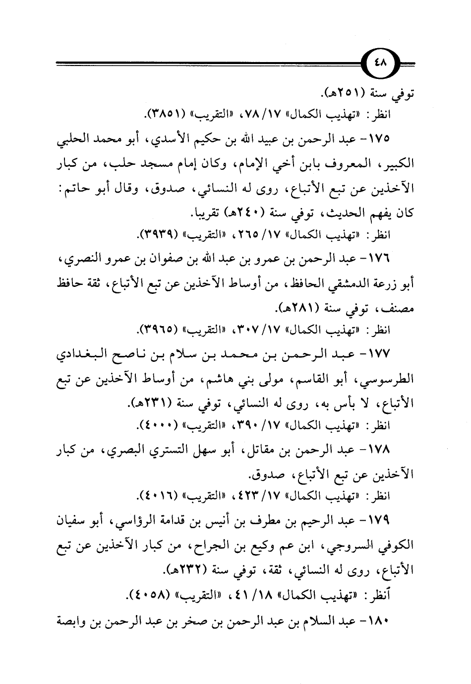 175 - عبد الرحمن بن عبيد الله بن حكيم الأسدي، أبو محمد الحلبي الكبير، المعروف بابن أخي الإمام، وكان إمام مسجد حلب، من كبار الآخذين عن تبع الأتباع، روى له النسائي، صدوق، وقال أبو حاتم: كان يفهم الحديث، توفي سنة (240 هـ) تقريبًا.