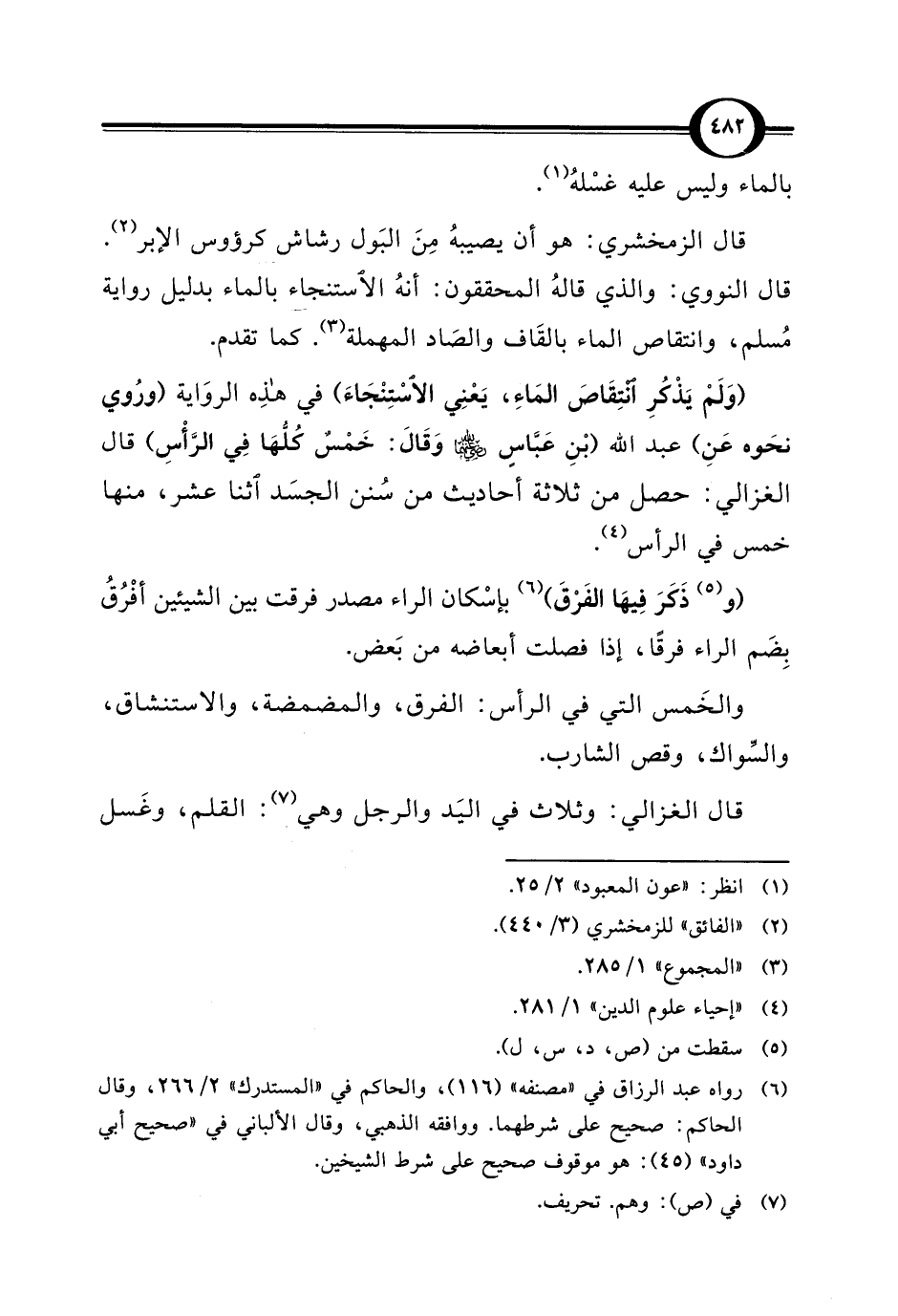 (وَلَمْ يَذْكُرِ انتِقَاصَ المَاءِ، يَعْنِي الاسْتِنْجَاءَ) في هذِه الروَاية (ورُوي نحَوه عَنِ) عبد الله (بْنِ عَبَّاسٍ - رضي الله عنهما - وَقَالَ: خَمْسٌ كُلُّهَا فِي الرَّأْسِ) قال الغزالي: حصل من ثلاثة أحاديث من سُنن الجسَد اثنا عشر، منها خمس في الرأس (¬4).