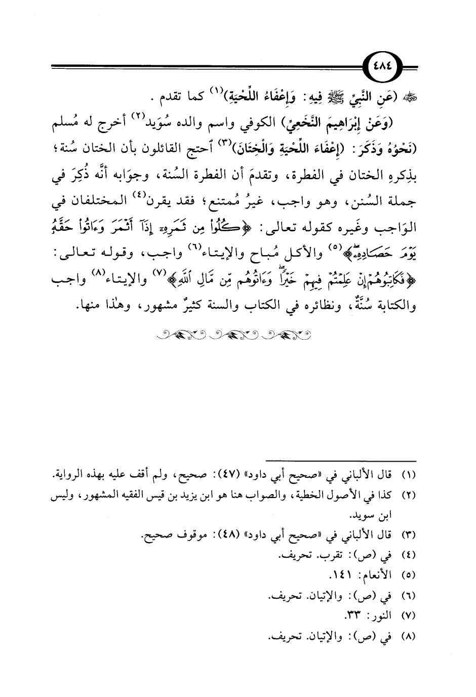 (وَعَنْ إِبْرَاهِيمَ النَّخَعِيِّ) الكوفي واسم والده سُوَيد (¬2) أخرج له مُسلم (نَحْوُهُ وَذَكَرَ: (إِعْفَاءَ اللِّحْيَةِ وَالْخِتَانَ) (¬3) احتج القائلون بأن الختان سُنة؛ بذِكرهِ الختان في الفطرة، وتقدمَ أن الفطرة السُّنة، وجوَابه أنَّه ذُكِرَ في جملة السُنن، وهو واجب، غيرُ مُمتنع؛ فقد يقرن (¬4) المختلفان في الوَاجب وغَيره كقوله تعالى: {كُلُوا مِنْ ثَمَرِهِ إِذَا أَثْمَرَ وَآتُوا حَقَّهُ يَوْمَ حَصَادِهِ} (¬5) والأكل مُباح والإيتاء (¬6) واجب، وقوله تعالى: {فَكَاتِبُوهُمْ إِنْ عَلِمْتُمْ فِيهِمْ خَيْرًا وَآتُوهُمْ مِنْ مَالِ اللَّهِ} (¬7) والإيتاء (¬8) واجب والكتابة سُنَّةٌ، ونظائره في الكتاب والسنة كثيرٌ مشهور، وهذا منها.