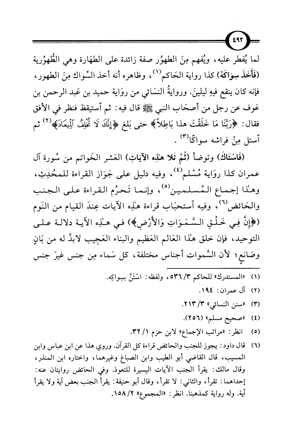 لما يُفطر عليه، ويُفهم مِنَ الطهوُر صفة زائدة على الطهَارة وهي الطُّهوُرية (فَأَخَذَ سِوَاكَهُ) كذا رواية الحَاكم (¬1)، وظاهره أنه أخذ السِّواك مِنَ الطهور، فإنه كان ينقع فيهِ ليلينَ. وروايةُ النسَائي من روَاية حميد بن عَبد الرحمن بن عَوف عن رجل من أصحَاب النبي - صلى الله عليه وسلم - قال فيه: ثم استيقظ فنظر في الأفق فقال: {رَبَّنَا مَا خَلَقْتَ هَذَا بَاطِلًا} حتى بَلغ {إِنَّكَ لَا تُخْلِفُ الْمِيعَادَ} (¬2) ثم استل مِنْ فراشه سواكًا (¬3).