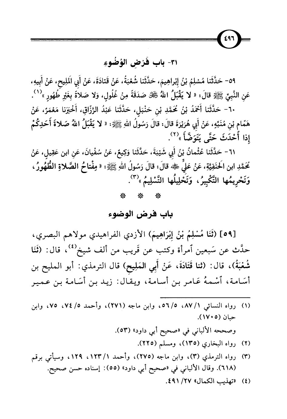 [59] (ثَنَا مُسْلِمُ بْنُ إِبْرَاهِيمَ) الأزدي الفراهيدي مولاهم البصري، حدَّث عن سَبعين امرأة وكتب عن قَريب من ألف شيخ (¬4)، قال: (ثَنَا شُعْبَةُ)، قال: (ثنا قَتَادَةَ، عَنْ أَبِي المَلِيحِ) قال الترمذي: أبو المليح بن أسَامة، اسْمهُ عَامر بن أسامة، ويقال: زيد بن أسَامة بن عمير