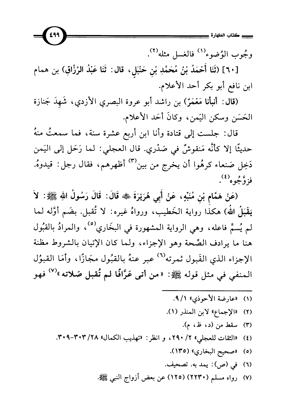 [60] (ثَنَا أَحْمَدُ بْنُ مُحَمَّدِ بْنِ حَنْبَلٍ، قال: ثَنَا عَبْدُ الرَّزَّاقِ) بن همام بن نافع أبو بكر أحد الأعلام.