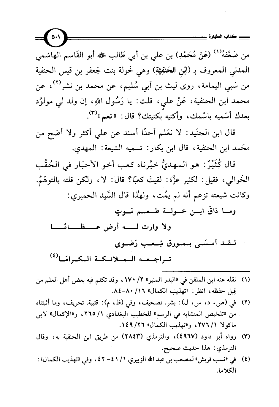 قال كُثَيِّر: هو المهديُّ خبَّرناه كعب أخو الأحبَار في الحُقُب الخَوالي، فقيل: لكثير عزَّة: لقيتَ كعبًا؟ قال: لا، ولكن قلته بالتوهّمُ. وكانت شيعته تزعم أنه لم يمُت، ولهذا قال السَّيد الحميري: