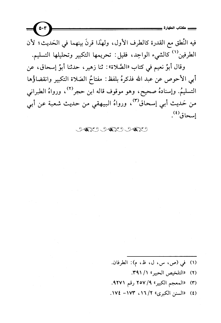 وقال أبو نعيم في كتاب "الصَّلاة": ثنا زهير، حدثنا أبوُ إسحاق، عن أبي الأحوص عن عبد الله فذكرهُ بلفظ: مفتاحُ الصَلاة التكبير وانقضاؤُها التسليمُ. وإسنادهُ صحيح، وهو موقوف قاله ابن حجر (¬2)، ورواهُ الطبراني من حَديث أبي إسحاق (¬3)، ورواهُ البيهقي من حديث شعبة عن أبي إسحاق (¬4).