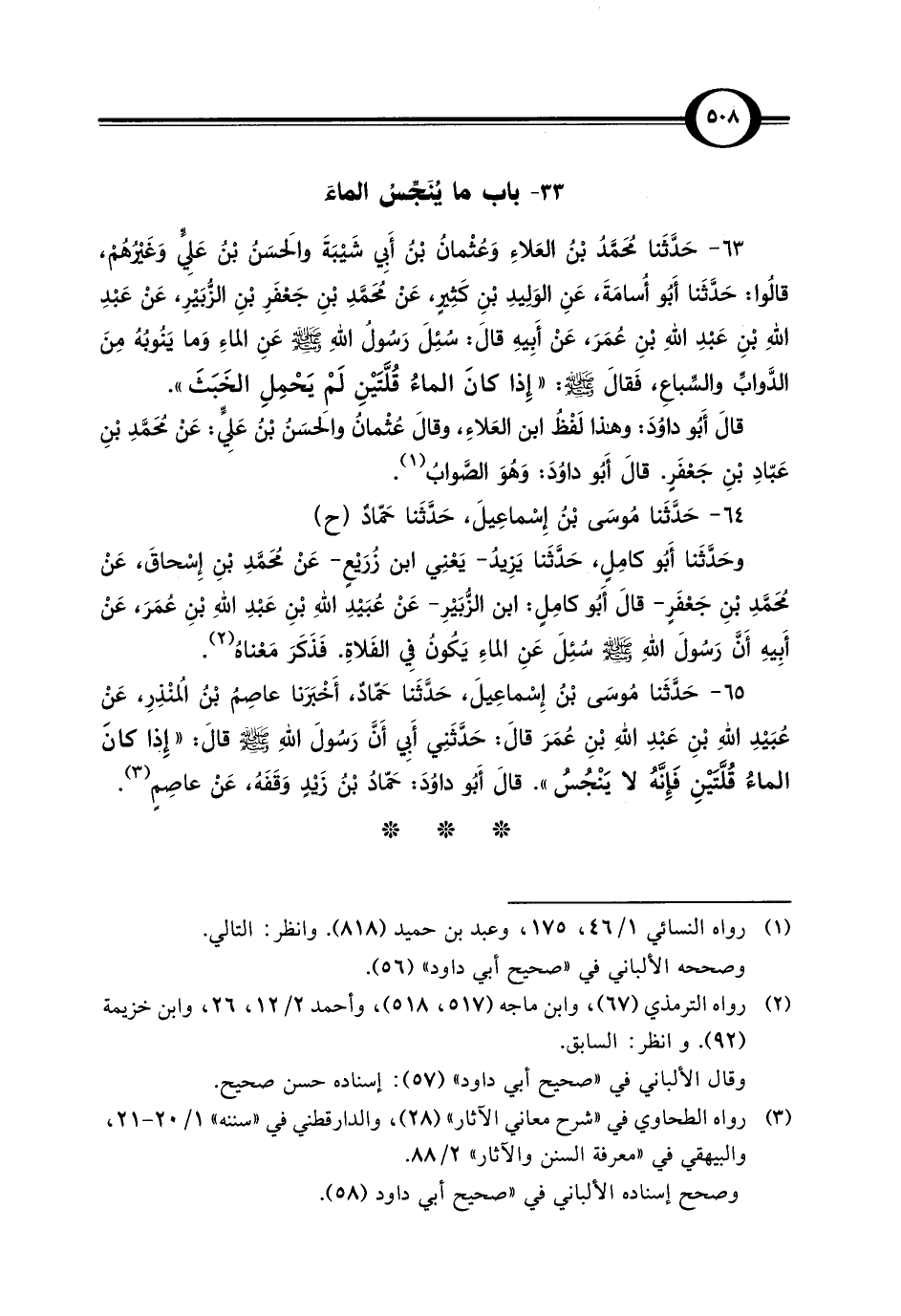 63 - حَدَّثَنا محَمَّد بْنُ العَلاءِ وَعُثْمانُ بْن أَبِي شَيْبَةَ والَحسَن بْنُ عَليٍّ وَغَيْرُهُمْ، قالُوا: حَدَّثَنا أَبُو أُسامَةَ، عَنِ الوَلِيدِ بْنِ كَثِيرٍ، عَنْ مُحَمَّدِ بْنِ جَعْفَرِ بْنِ الزُّبَيْرِ، عَنْ عَبْدِ اللهِ بْنِ عَبْدِ اللهِ بْنِ عُمَرَ، عَنْ أَبِيهِ قالَ: سُئِلَ رَسُول اللهِ - صلى الله عليه وسلم - عَنِ الماءِ وَما يَنُوبُهُ مِنَ الدَّوابِّ والسِّباعِ، فَقالَ - صلى الله عليه وسلم -: "إِذا كانَ الماءُ قُلَّتَيْنِ لَمْ يَحْمِلِ الخَبَثَ".