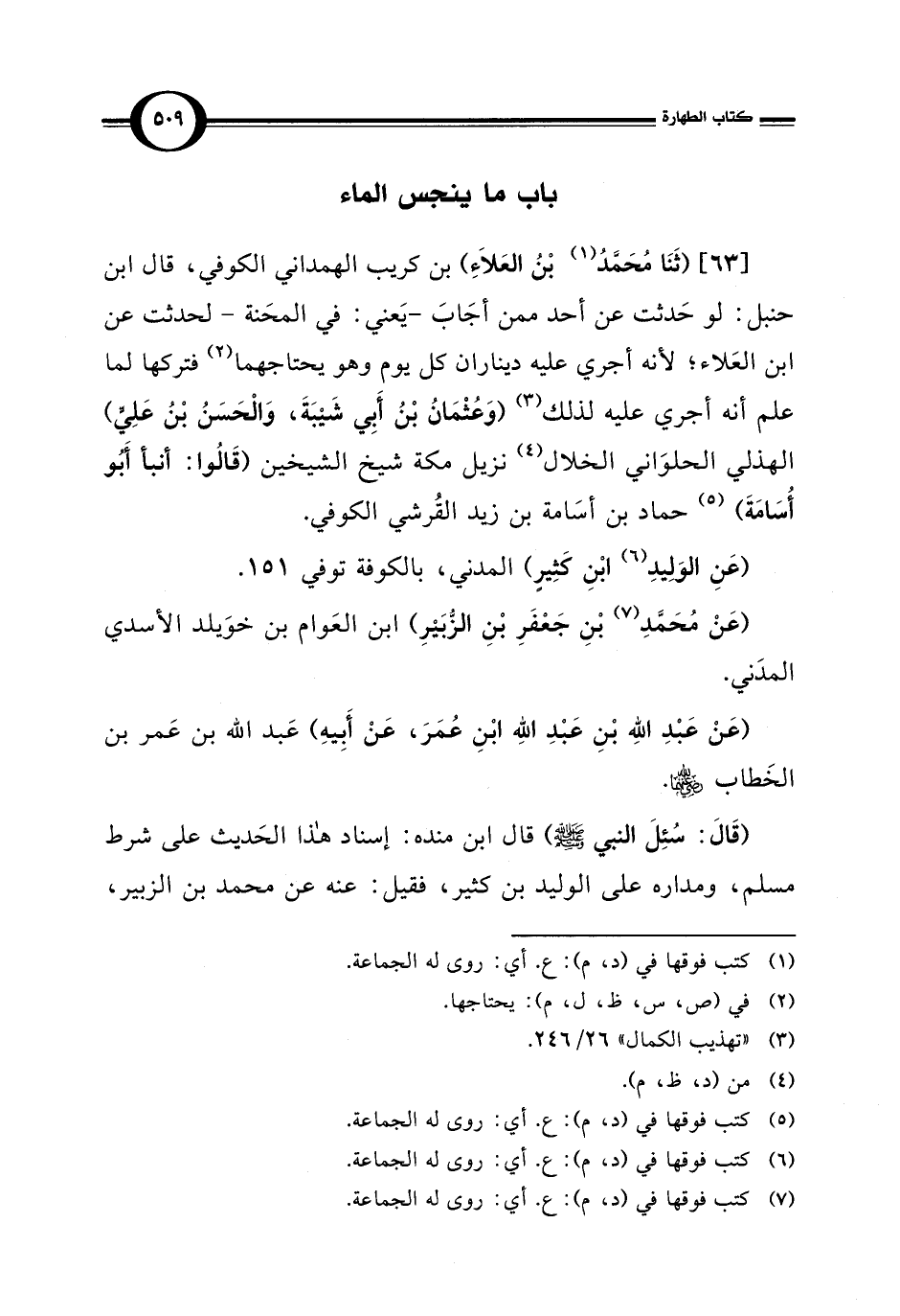 [63] (ثَنَا مُحَمَّدُ (¬1) بْنُ العَلاَءِ) بن كريب الهمداني الكوفي، قال ابن حنبل: لو حَدثت عن أحد ممن أجَابَ - يَعني: في المحنة - لحدثت عن ابن العَلاء؛ لأنه أجري عليه ديناران كل يوم وهو يحتاجهما (¬2) فتركها لما علم أنه أجري عليه لذلك (¬3) (وَعُثْمَانُ بْنُ أَبِي شَيْبَةَ، وَالْحَسَنُ بْنُ عَلِيٍّ) الهذلي الحلوَاني الخلال (¬4) نزيل مكة شيخ الشيخين (قَالُوا: أنبأ أَبُو أُسَامَةَ) (¬5) حماد بن أسَامة بن زيد القُرشي الكوفي.