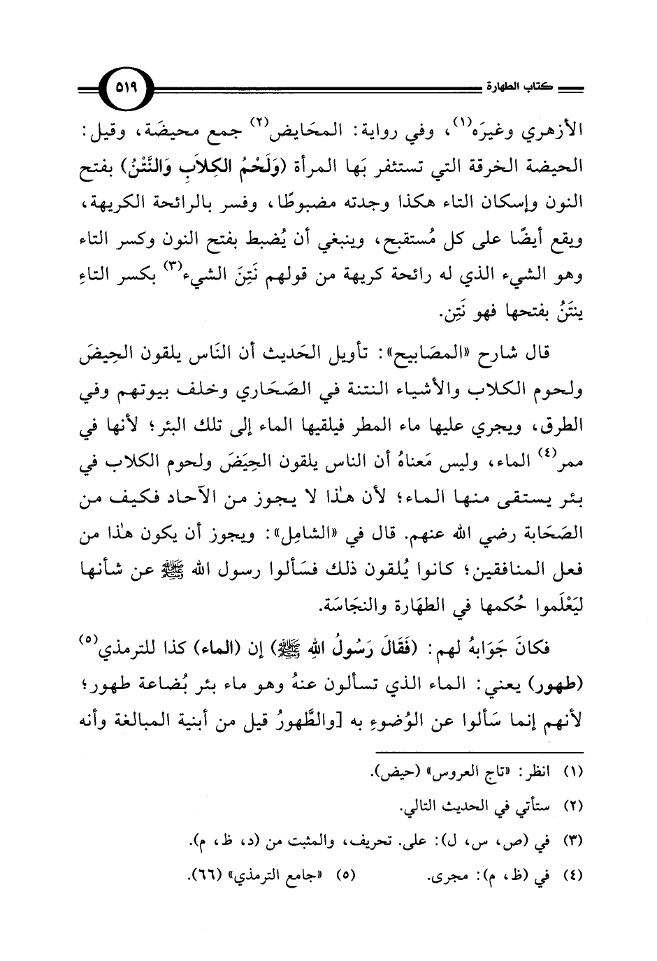 قال شارح "المصابيح": تأويل الحَديث أن النَاس يلقون الحِيضَ ولحوم الكلاب والأشياء النتنة في الصَحَاري وخلف بيوتهم وفي الطرق، ويجري عليها ماء المطر فيلقيها الماء إلى تلك البئر؛ لأنها في ممر (¬4) الماء، وليس مَعناهُ أن الناس يلقون الحِيَضَ ولحوم الكلاب في بئر يستقى منها الماء؛ لأن هذا لا يجوز من الآحاد فكيف من الصَحَابة رضي الله عنهم. قال في "الشامِل": ويجوز أن يكون هذا من فعل المنافقين؛ كانوا يُلقون ذلك فسَألوا رسول الله - صلى الله عليه وسلم - عن شأنها ليَعْلَموا حُكمها في الطهَارة والنجَاسَة.