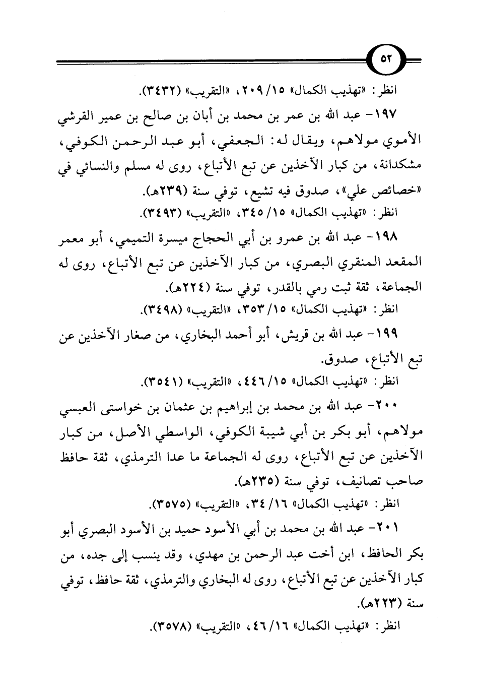 198 - عبد الله بن عمرو بن أبي الحجاج ميسرة التميمي، أبو معمر المقعد المنقري البصري، من كبار الآخذين عن تبع الأتباع، روى له الجماعة، ثقة ثبت رمي بالقدر، توفي سنة (224 هـ).