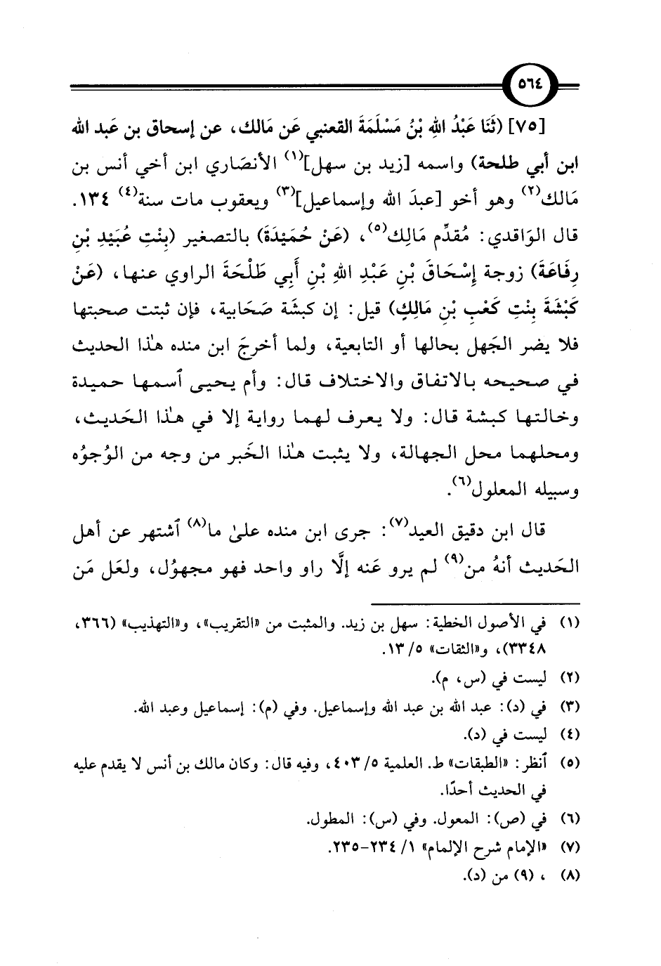 [75] (ثَنَا عَبْدُ الله بْنُ مَسْلَمَةَ القعنبي عَن مَالك، عن إسحاق بن عَبد الله بن أبي طلحة) واسمه [زيد بن سهل] (¬1) الأنصَاري ابن أخي أنس بن مَالك (¬2) وهو أخو [عبدَ الله وإسماعيل] (¬3) ويعقوب مات سنة (¬4) 134.
