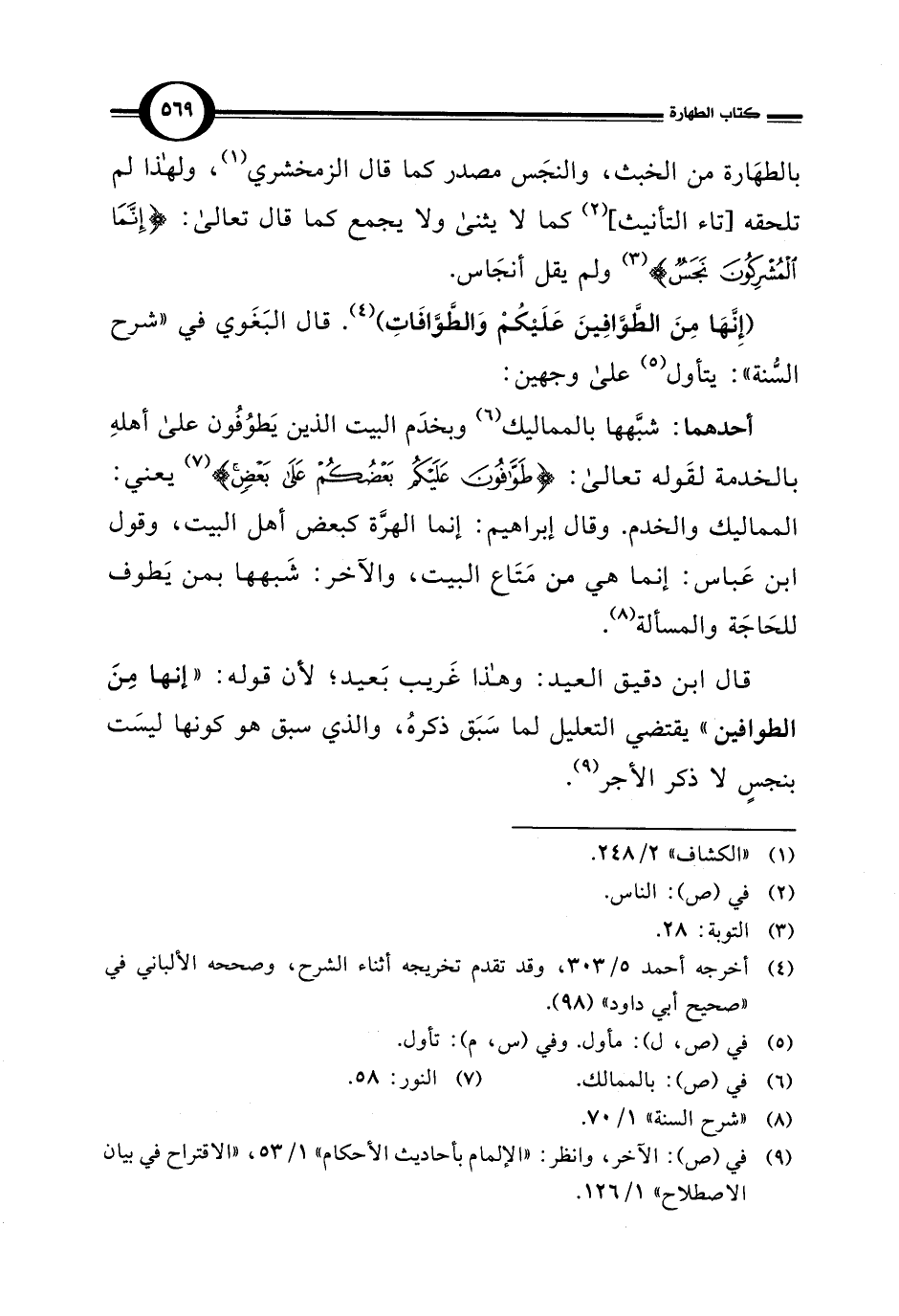 قال ابن دقيق العيد: وهذا غَريب بَعيد؛ لأن قوله: "إنها مِنَ الطوافين" يقتضي التعليل لما سَبَق ذكرهُ، والذي سبق هو كونها ليسَت بنجسٍ لا ذكر الأجر (¬9).