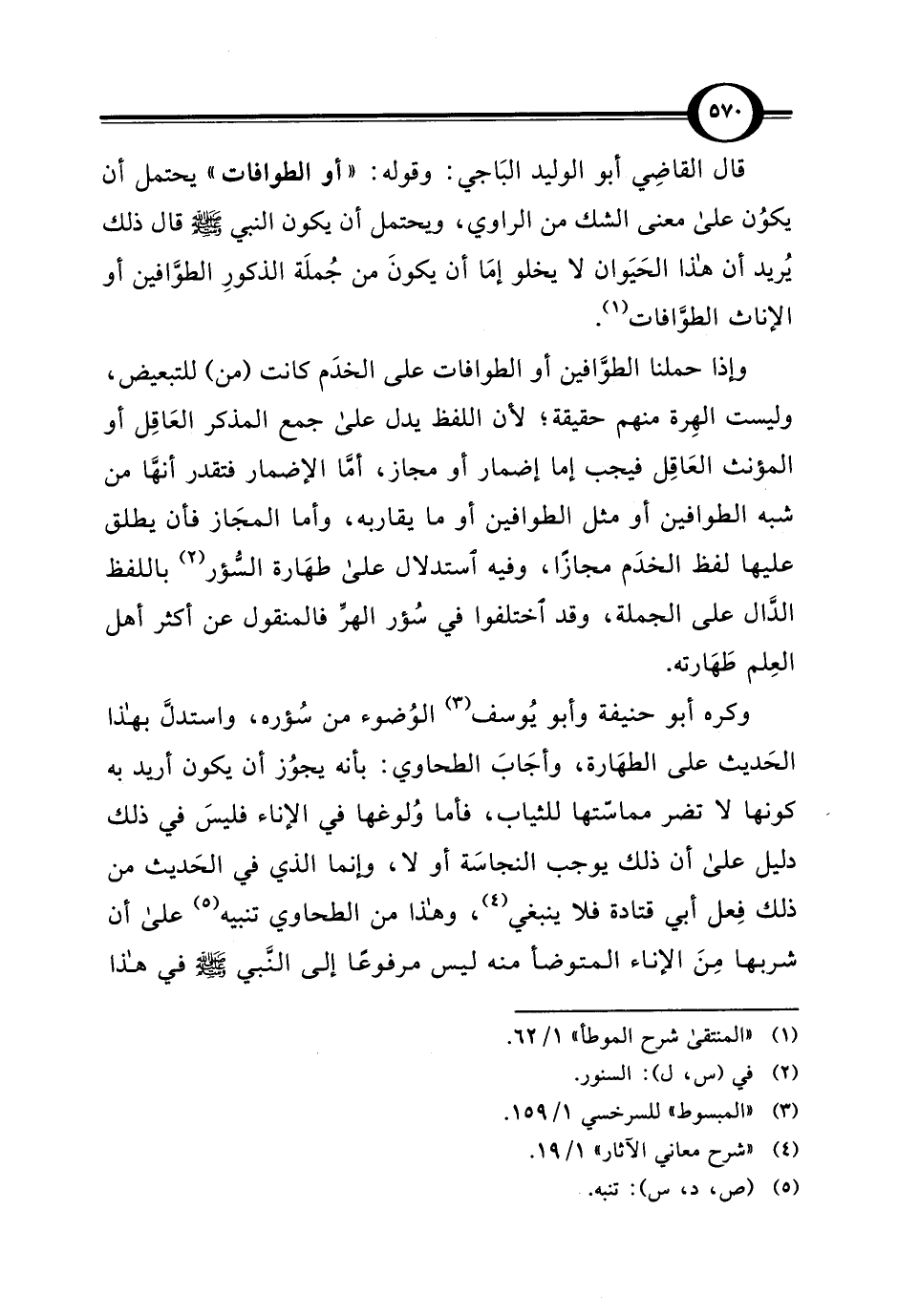 قال القاضِي أبو الوليد البَاجي: وقوله: "أو الطوافات" يحتمل أن يكُون على معنى الشَّك من الراوي، ويحتمل أن يكون النبي - صلى الله عليه وسلم - قال ذلك يُريد أن هذا الحَيَوان لا يخلو إمَّا أن يكونَ من جُملَة الذكورِ الطوَّافين أو الإناث الطوَّافات (¬1).