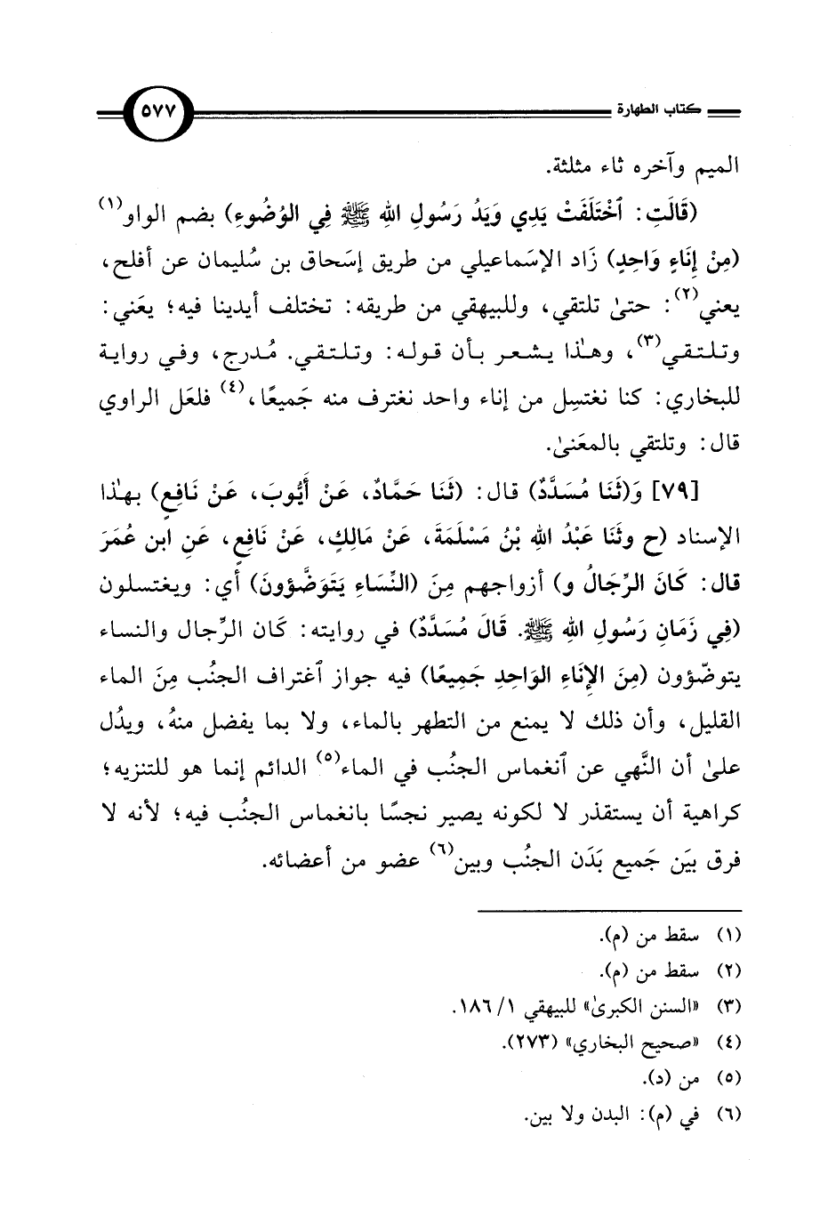 [79] وَ (ثَنَا مُسَدَّدٌ) قال: (ثَنَا حَمَّادٌ، عَنْ أَيُّوبَ، عَنْ نَافِعٍ) بهذا الإسناد (ح وثَنَا عَبْدُ الله بْنُ مَسْلَمَةَ، عَنْ مَالِكٌ، عَنْ نَافِعٍ، عَنِ ابن عُمَرَ قال: كانَ الرِّجَالُ و) أزواجهم مِنَ (النِّسَاءِ يَتَوَضَّؤونَ) أي: ويغتسلون (فِي زَمَانِ رَسُولِ الله - صلى الله عليه وسلم -. قَالَ مسدد) في روايته: كَان الرّجال والنساء يتوضّؤون (مِنَ الإِنَاءِ الوَاحِدِ جَمِيعًا) فيه جواز اغتراف الجنُب مِنَ الماء القليل، وأن ذلك لا يمنع من التطهر بالماء، ولا بما يفضل منهُ، ويدُل على أن النَّهي عن انغماس الجنُب في الماء (¬5) الدائم إنما هو للتنزيه؛ كراهية أن يستقذر لا لكونه يصير نجسًا بانغماس الجنُب فيه؛ لأنه لا فرق بيَن جَميع بَدَن الجنُب وبين (¬6) عضو من أعضائه.