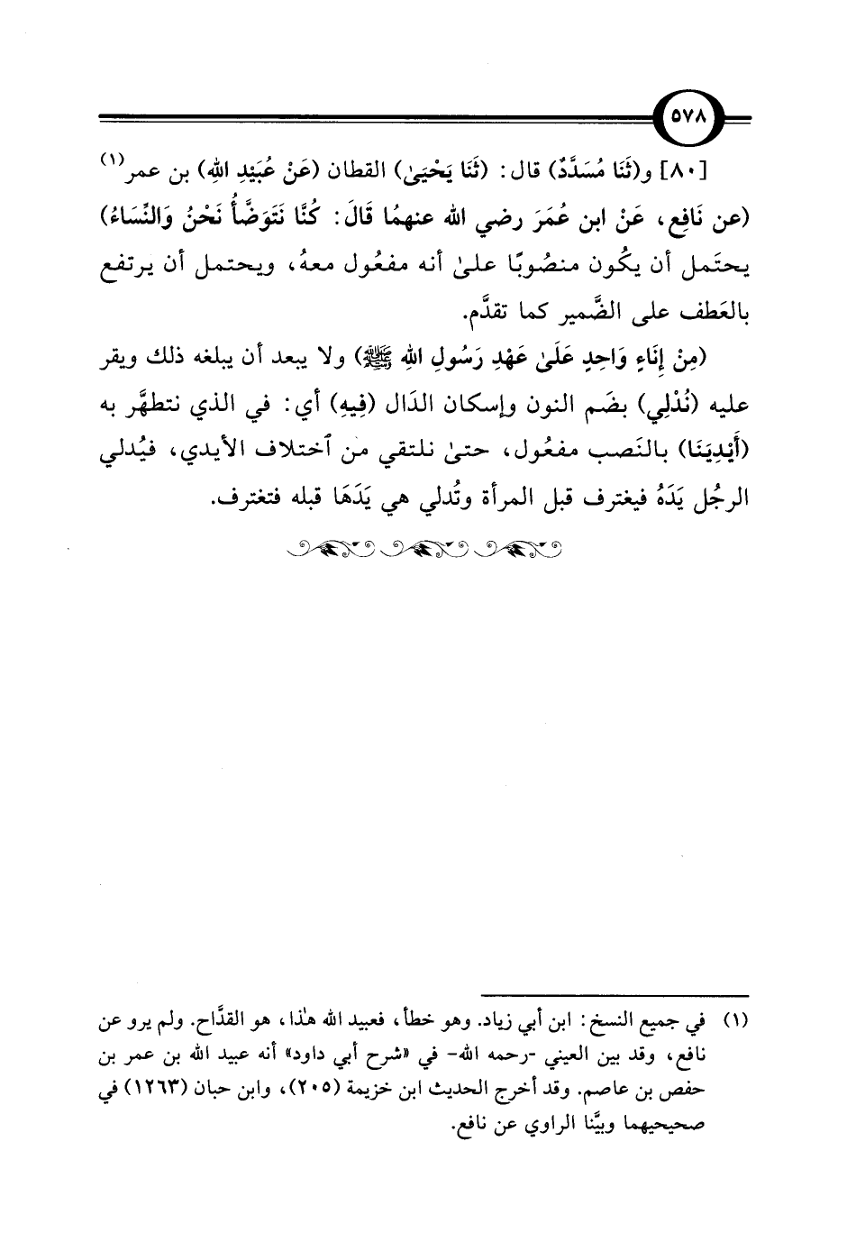 [80] و (ثَنَا مسدد) قال: (ثَنَا يَحْيَى) القطان (عَنْ عُبَيدِ الله) بن عمر (¬1) (عن نَافِع، عَنْ ابن عُمَرَ رضي الله عنهمُا قَالَ: كُنا نَتَوَضَّأُ نَحْنُ وَالنسَاءُ) يحتَمل أن يكُون منصُوبًا على أنه مفعُول معهُ، ويحتمل أن يرتفع بالعَطف على الضَّمير كما تقدَّم.