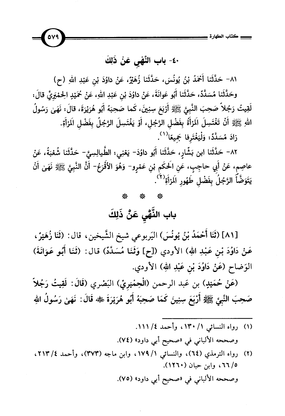 وحَدَّثَنا مُسَدَّدٌ، حَدَّثَنا أَبو عَوانَةَ، عَنْ داوُدَ بْنِ عَبْدِ اللهِ، عَنْ حميْدٍ الِحمْيَرِيِّ قالَ: لَقِيت رَجُلًا صَحِبَ النَّبِيَّ - صلى الله عليه وسلم - أربعَ سِنِينَ، كَما صَحِبَهُ أَبو هريرة، قالَ: نَهَى رَسُولُ اللهِ - صلى الله عليه وسلم - أَنْ تَغْتَسِلَ المَرْأة بِفَضْلِ الرَّجُلِ، أَوْ يَغْتَسِلَ الرَّجُلُ بِفَضْلِ المَرْأَةِ.
