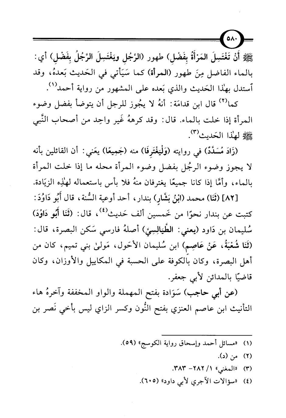 كما (¬2) قال ابن قدامَة: أنهُ لا يجُوز للرجل أن يتوضأ بفضل وضوء المرأة إذا خلت بالماء. قال: وقد كرههُ غَير واحِد من أصحاب النَّبي - صلى الله عليه وسلم - لهذا الحَديث (¬3).
