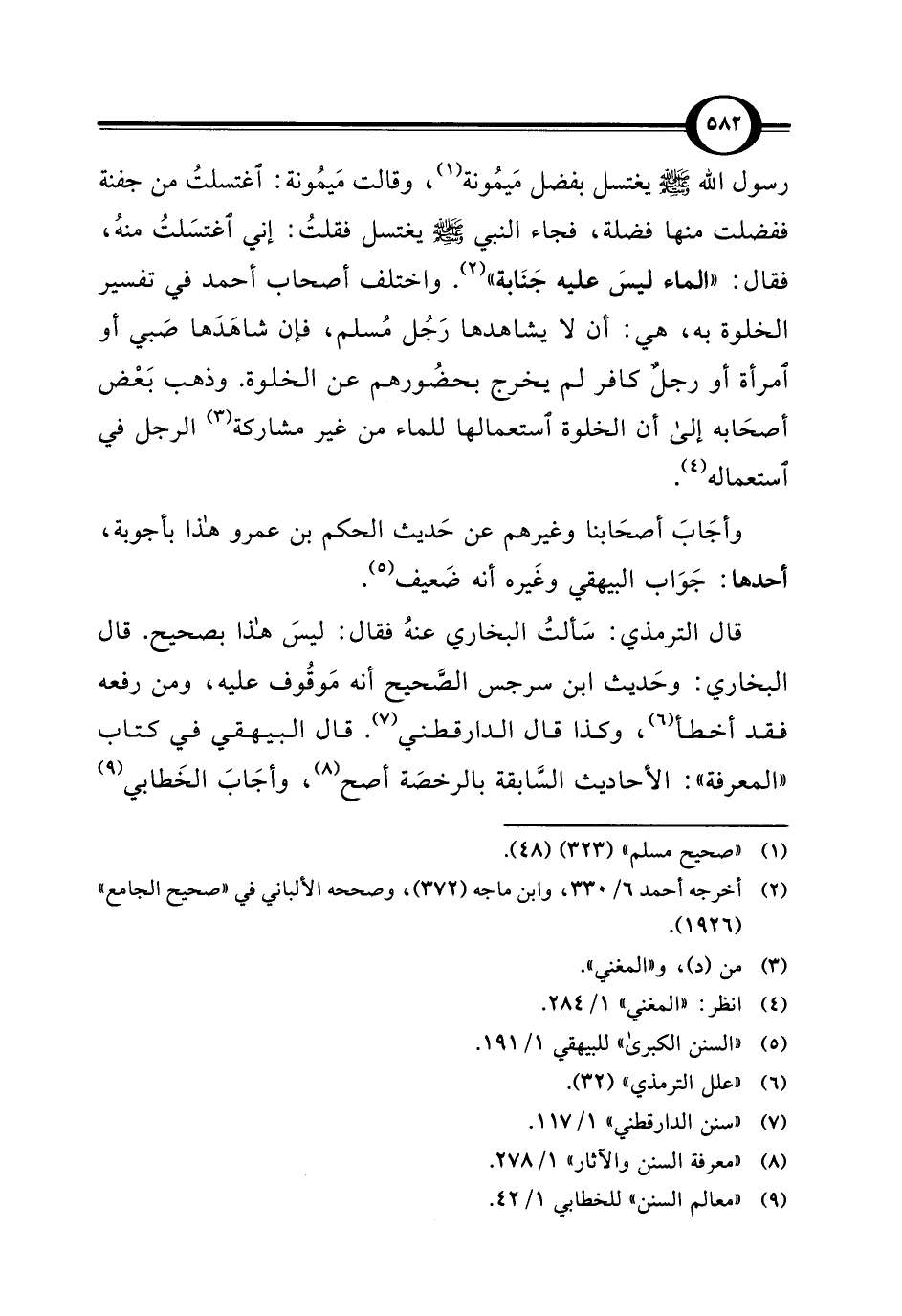 رسول الله - صلى الله عليه وسلم - يغتسل بفضل مَيمُونة (¬1)، وقالت مَيمُونة: اغتسلتُ من جفنة ففضلت منها فضلة، فجاء النبي - صلى الله عليه وسلم - يغتسل فقلتُ: إنِّي اغتسَلتُ منهُ، فقال: "الماء ليسَ عليه جَنَابة" (¬2). واختلف أصحاب أحمد في تفسير الخلوة به، هي: أن لا يشاهدها رَجُل مُسلم، فإن شاهَدَها صَبي أو امرأة أو رجلٌ كافر لم يخرج بحضُورهم عن الخلوة. وذهب بَعْض أصحَابه إلى أن الخلوة استعمالها للماء من غير مشاركة (¬3) الرجل في استعماله (¬4).