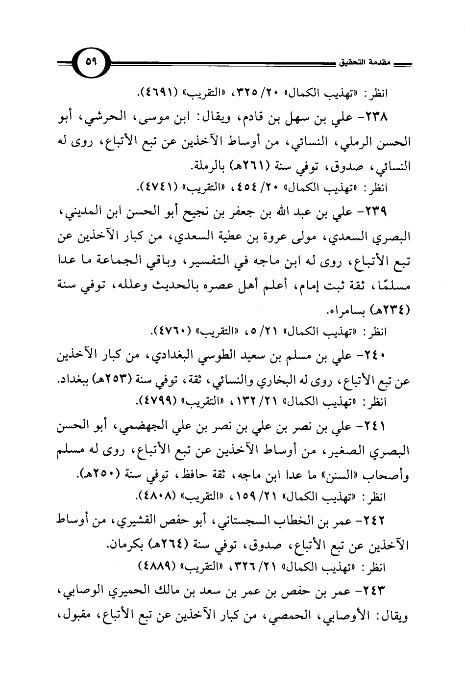 239 - علي بن عبد الله بن جعفر بن نجيح أبو الحسن بن المديني، البصري السعدي، مولى عروة بن عطية السعدي، من كبار الآخذين عن تبع الأتباع، روى له ابن ماجه في التفسير، وباقي الجماعة ما عدا مسلمًا، ثقة ثبت إمام، أعلم أهل عصره بالحديث وعلله، توفي سنة (234 هـ) بسامراء.