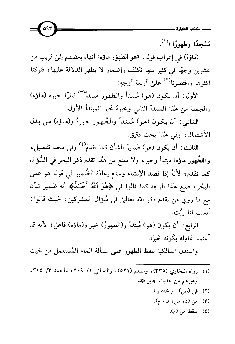 الأول: أن يكون (هو) مُبتدأ والطهور مبتدأ (¬3) ثانيًا خبره (ماؤه) والجملة من هذا المبتدأ الثاني وخبرهُ خَبر للمبتدأ الأول.