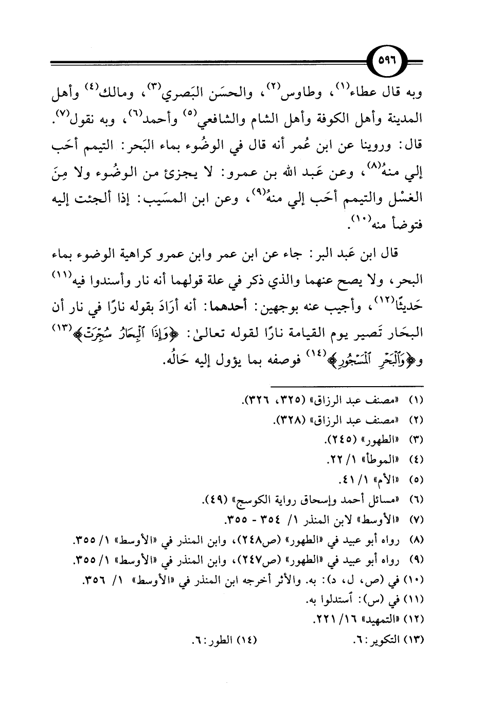 قال ابن عَبد البر: جاء عن ابن عمرو ابن عمرو كراهية الوضوء بماء البحر، ولا يصح عنهما والذي ذكر في علة قولهما أنه نار وأسندوا فيه (¬11) حَديثًا (¬12)، وأجيب عنه بوجهين: أحدهما: أنه أرَادَ بقوله نارًا في نار أن البحَار تَصير يوم القيامة نارًا لقوله تعالى: {وَإِذَا الْبِحَارُ سُجِّرَتْ} (¬13) {وَالْبَحْرِ الْمَسْجُورِ} (¬14) فوصفه بما يؤول إليه حَالُه.