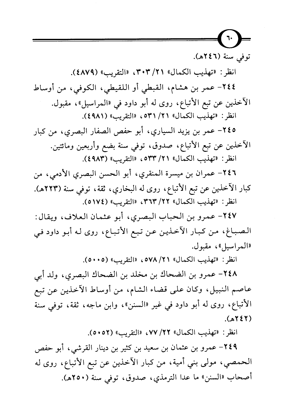 246 - عمران بن ميسرة المنقري، أبو الحسن البصري الأدمي، من كبار الآخذين عن تبع الأتباع، روى له البخاري، ثقة، توفي سنة (223 هـ).