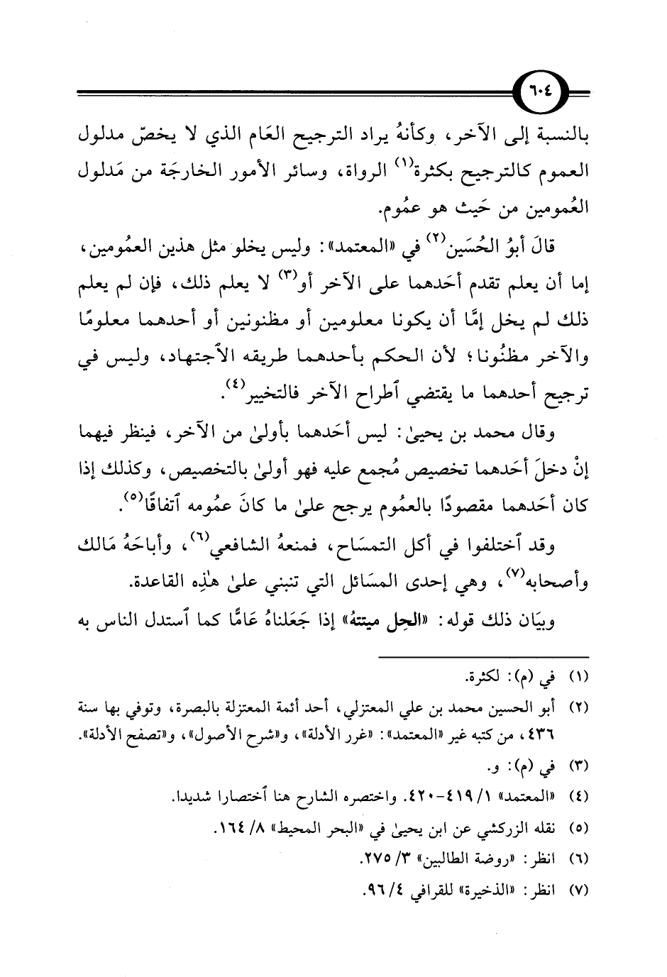 قالَ أبوُ الحُسَين (¬2) في "المعتمد": وليس يخلو مثل هذين العمُومين، إما أن يعلم تقدم أحَدهما على الآخر أو (¬3) لا يعلم ذلك، فإن لم يعلم ذلك لم يخل إمَّا أن يكونا معلومين أو مظنونين أو أحدهما معلومًا والآخر مظنُونا؛ لأن الحكم بأحدهما طريقه الاجتهاد، وليس في ترجيح أحدهما ما يقتضي اطراح الآخر فالتخيير (¬4).