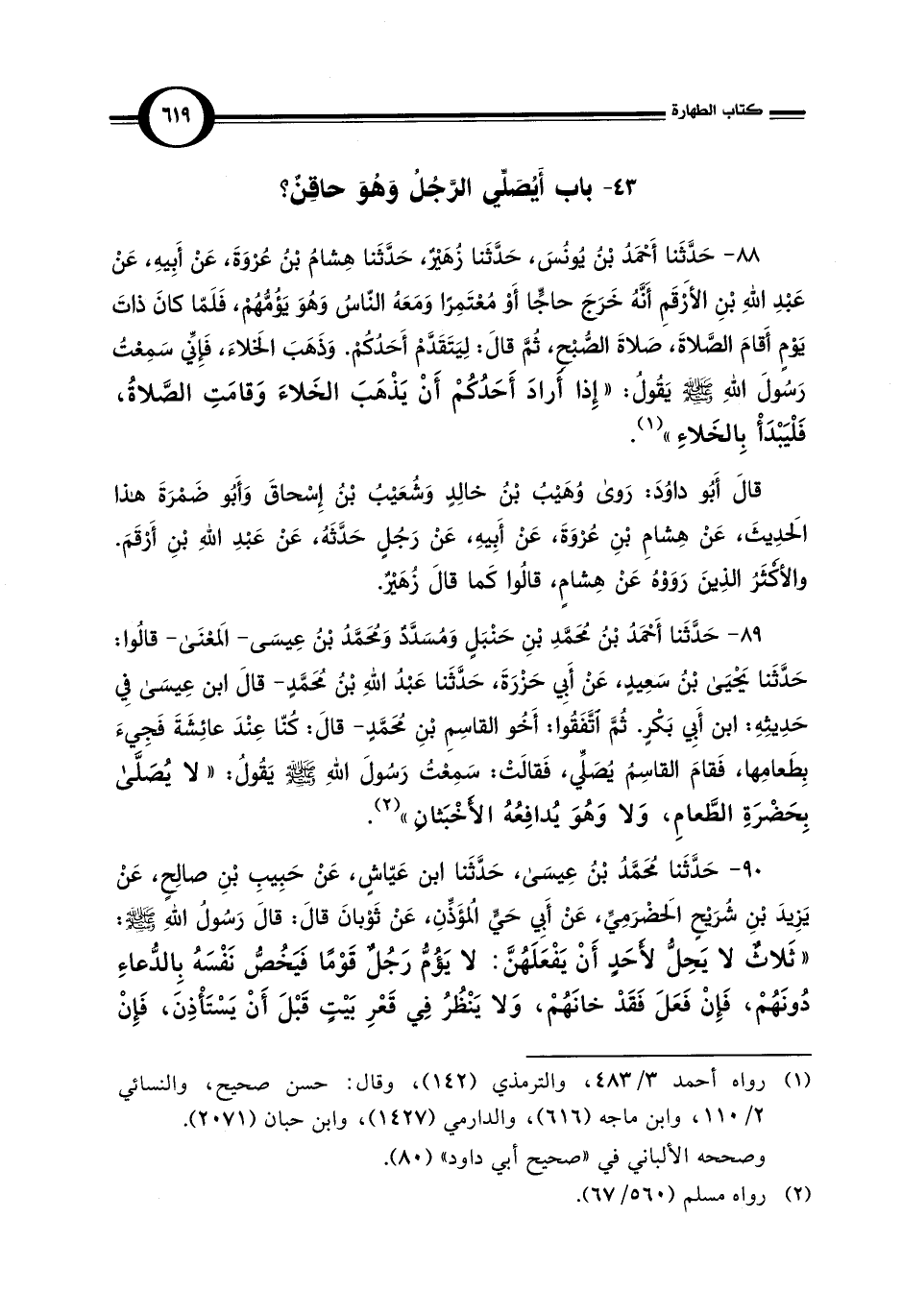 89 - حَدَّثَنا أَحْمَدُ بْن مُحَمَّدِ بْنِ حَنْبَلٍ وَمُسَدَّدٌ وَمحَمَّدُ بْن عِيسَى - المعْنَى - قالُوا: حَدَّثَنا يحيى بْنُ سَعِيدٍ، عَنْ أَبِي حَزْرَةَ، حَدَّثَنا عَبْدُ اللهِ بْنُ مُحَمَّدٍ - قالَ ابن عِيسَى فِي حَدِيثِهِ: ابن أَبِي بَكْرٍ. ثُمَّ اتَّفَقُوا: أَخُو القاسِمِ بْنِ محَمَّدٍ - قالَ: كُنّا عِنْدَ عائِشَةَ فَجِيءَ بِطَعامِها، فَقامَ القاسِمُ يُصَلِّي، فَقالَتْ: سَمِعْتُ رَسُولَ اللهِ - صلى الله عليه وسلم - يَقُولُ: "لا يُصَلَّى بِحَضْرَةِ الطَّعامِ، وَلا وَهُوَ يُدافِعُهُ الأخْبَثَانِ" (¬2).
