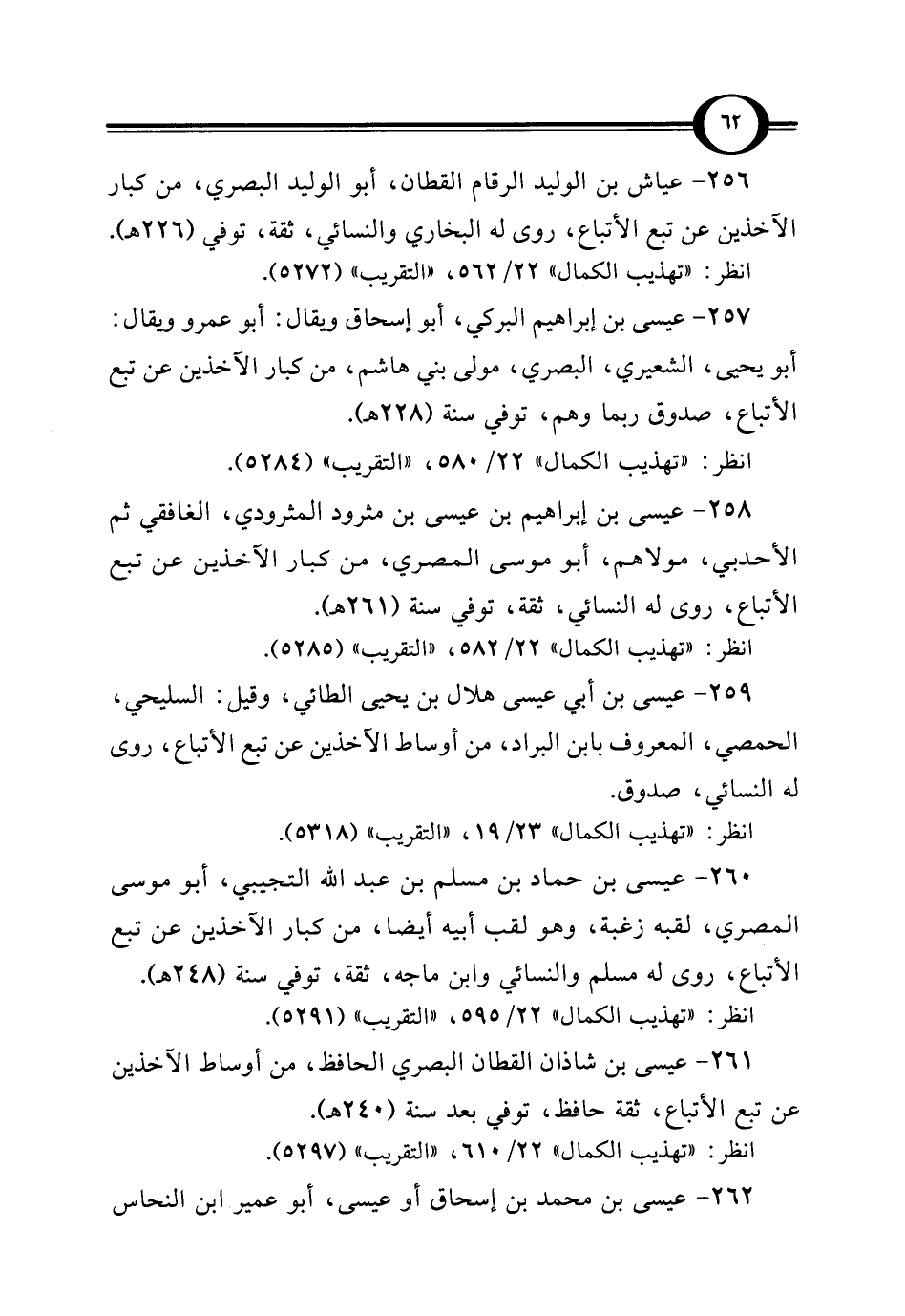 258 - عيسى بن إبراهيم بن عيسى بن مثرود المثرودي، الغافقي ثمَّ الأحدبي، مولاهم، أبو موسى المصري، من كبار الآخذين عن تبع الأتباع، روى له النسائي، ثقة، توفي سنة (261 هـ).