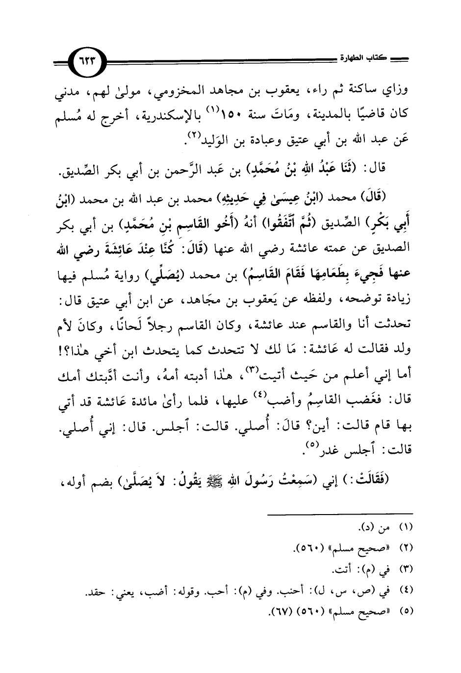 (قَالَ) محمد (ابْنُ عِيسَى فِي حَدِيثِهِ) محمد بن عبد الله بن محمد (ابْنُ أَبِي بَكْرٍ) الصِّديق (ثُمَّ اتَّفَقُوا) أنهُ (أَخُو القَاسِمِ بْنِ مُحَمَدٍ) بن أبي بكر الصديق عن عمته عائشة رضي الله عنها (قَالَ: كنَّا عِنْدَ عَائِشَةَ رضي الله عنها فَجِيءَ بِطَعَامِهَا فَقَامَ القَاسِمُ) بن محمد (يُصَلِّي) رواية مُسلم فيها زيادة توضحه، ولفظه عن يَعقوب بن مجَاهد، عن ابن أبي عتيق قال: تحدثت أنا والقاسم عند عائشة، وكان القاسم رجلًا لَحانًا، وكانَ لأم ولد فقالت له عَائشة: مَا لك لا تتحدث كما يتحدث ابن أخي هذا؟ ! أما إني أعلم من حَيث أتيت (¬3)، هذا أدبته أمهُ، وأنت أذَبتك أمك قال: فغَضب القاسِمُ وأضب (¬4) عليها، فلما رأى مائدة عَائشة قد أتي بها قام قالت: أين؟ قالَ: أُصلي. قالت: اجلس. قال: إني أُصلي. قالت: اجلس غدر (¬5).