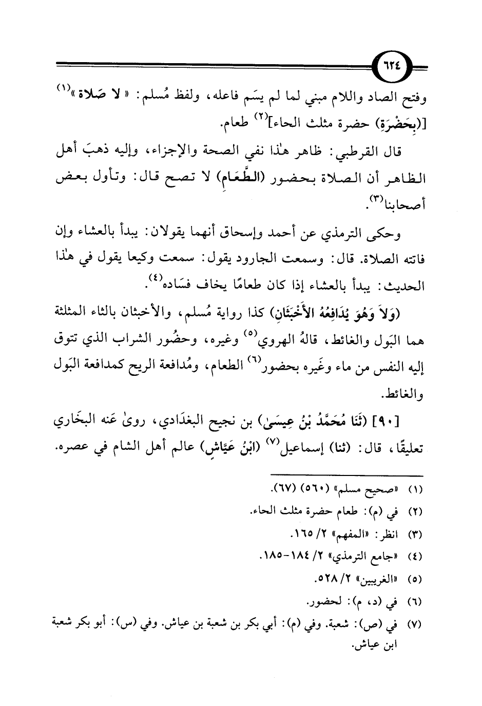 قال القرطبي: ظاهر هذا نفي الصحة والإجزاء، وإليه ذهبَ أهل الظاهر أن الصلاة بحضور (الطَّعَامِ) لا تصح قال: وتأول بعض أصحابنا (¬3).