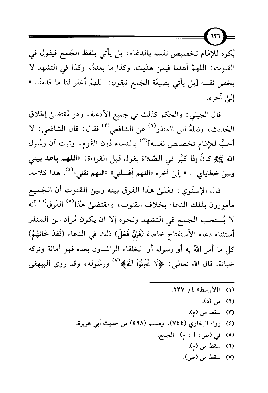 قال الجيلي: والحكم كذلك في جميع الأدعية، وهو مُقتضى إطلاق الحَديث، ونقلهُ ابن المنذر (¬1) عن الشافعي (¬2) فقال: قال الشافعي: لا أحبُّ للإمَام تخصيص نفسه] (¬3) بالدعاء دُون القَوم، وثبت أن رسُول الله - صلى الله عليه وسلم - كانَ إذا كبَّر في الصَّلاة يقول قبل القراءة: "اللهم باعد بيني وبينَ خطاياي ... " إلى آخره "اللهم اغسلني" "اللهم نقني" (¬4). هذا كلامه.