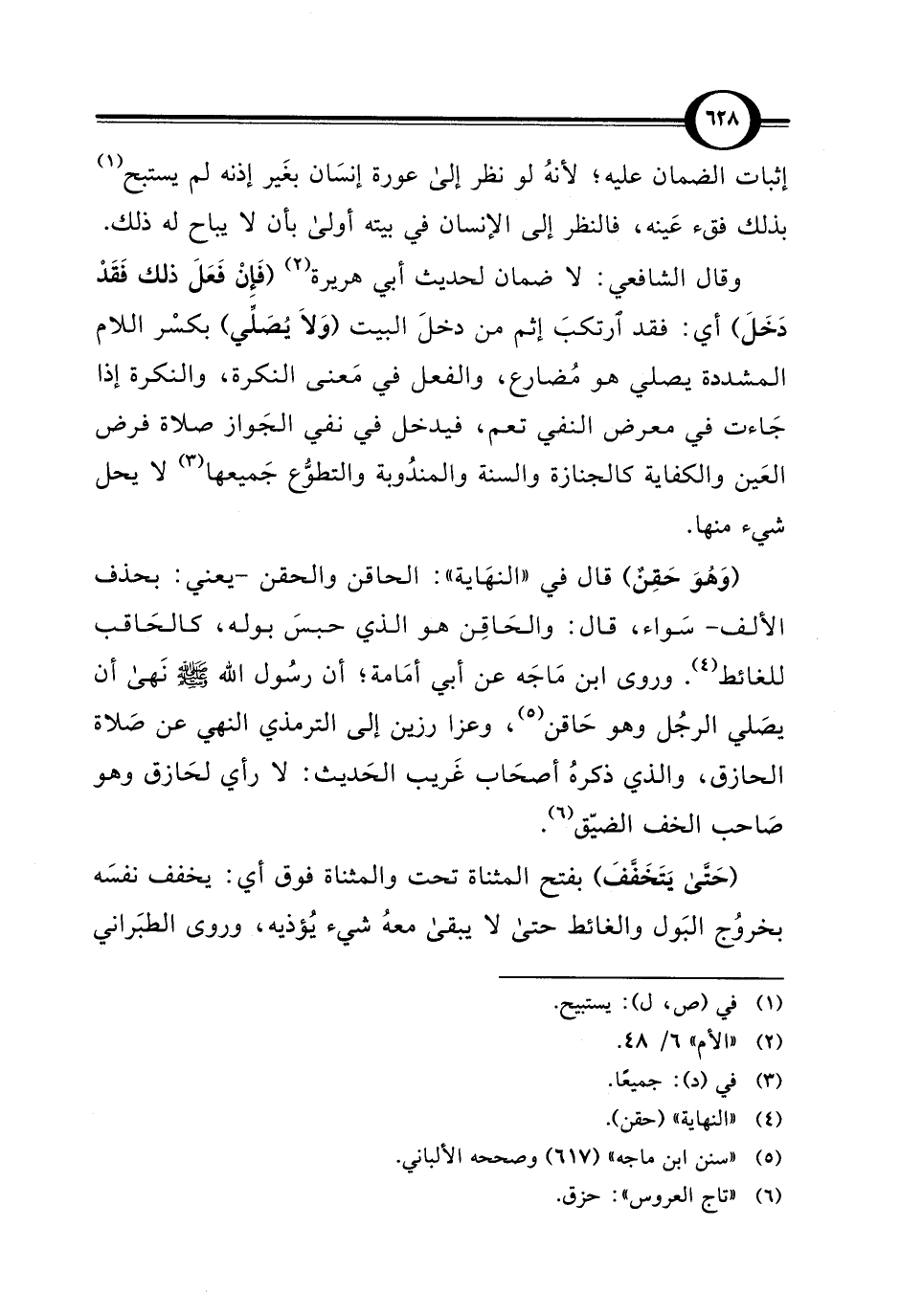 (وَهُوَ حَقِنٌ) قال في "النهَاية"؛ الحاقن والحقن -يعني: بحذف الألف- سَواء، قال: والحَاقِن هو الذي حبسَ بوله، كالحَاقب للغائط (¬4). وروى ابن مَاجَة عن أبي أمَامة؛ أن رسُول الله - صلى الله عليه وسلم - نَهى أن يصَلي الرجُل وهو حَاقن (¬5)، وعزا رزين إلى الترمذي النهي عن صَلاة الحازق، والذي ذكرهُ أصحَاب غَريب الحَديث: لا رأي لحَازق وهو صَاحب الخف الضيّق (¬6).