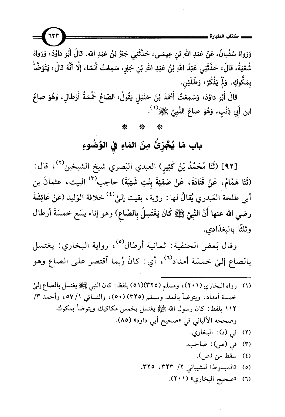 (¬1) رواه البخاري (201)، ومسلم (325) (51) بلفظ: كان النبي - صلى الله عليه وسلم - يغتسل بالصاع إلى خمسة أمداد، ويتوضأ بالمد. ومسلم (325) (50)، والنسائي 1/ 57، وأحمد 3/ 112 بلفظ: كان رسول الله - صلى الله عليه وسلم - يغتسل بخمس مكاكيك ويتوضأ بمكوك.