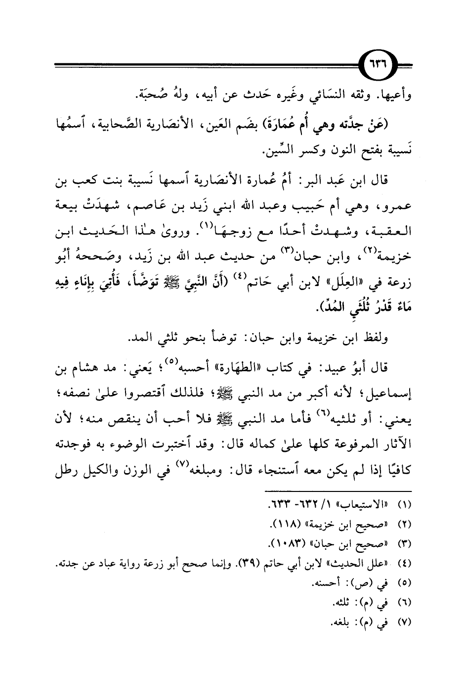 قال ابن عَبد البر: أمُّ عُمارة الأنصَارية اسمها نَسيبة بنت كعب بن عمرو، وهي أم حَبيب وعبد الله ابني زَيد بن عَاصم، شهدَتْ بيعة العقبة، وشهدتْ أحدًا مع زوجهَا (¬1). وروى هذا الحَديث ابن خزيمة (¬2)، وابن حبان (¬3) من حديث عبد الله بن زَيد، وصَحَّحهُ أبُو زرعة في "العِلَل" لابن أبي حَاتم (¬4) (أَنَّ النَّبِيَّ - صلى الله عليه وسلم - تَوَضَّأَ، فَأُتِيَ بِإِنَاءٍ فِيهِ مَاءٌ قَدْرُ ثُلُثَيِ المُدِّ).