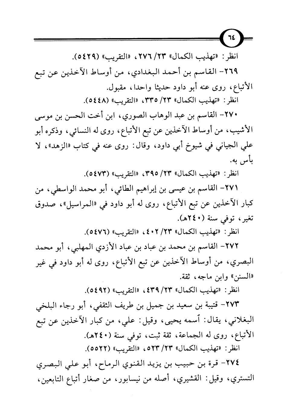 272 - القاسم بن محمَّد بن عباد بن عباد الأزدي المهلبي، أبو محمَّد البصري، من أوساط الآخذين عن تبع الأتباع، روى له أبو داود في غير "السنن" وابن ماجه، ثقة.