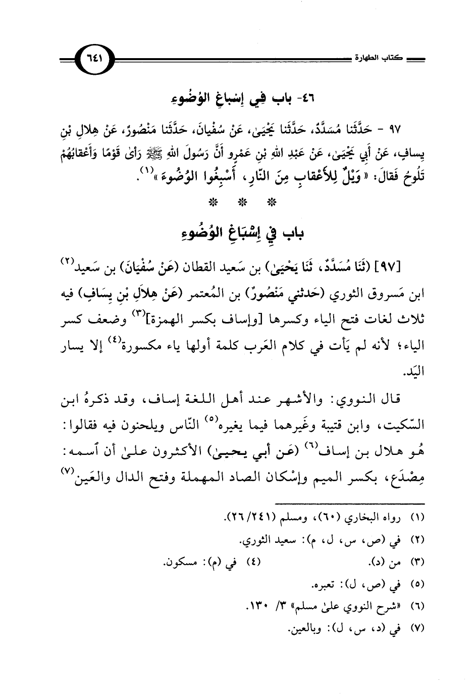 97 - حَدَّثَنا مُسَدَّدٌ، حَدَّثَنا يَحْيَى، عَنْ سُفْيانَ، حَدَّثَنا مَنْصُورٌ، عَنْ هِلالِ بْنِ يِسافٍ، عَنْ أَبي يَحْيَى، عَنْ عَبْدِ اللهِ بْنِ عَمْرٍو أَنَّ رَسُولَ اللهِ - صلى الله عليه وسلم - رَأى قَوْمًا وَأَعْقابُهُمْ تَلُوحُ فَقالَ: "وَيْلٌ لِلأَعْقابِ مِنَ النَّارِ، أَسْبِغُوا الوُضُوءَ" (¬1).